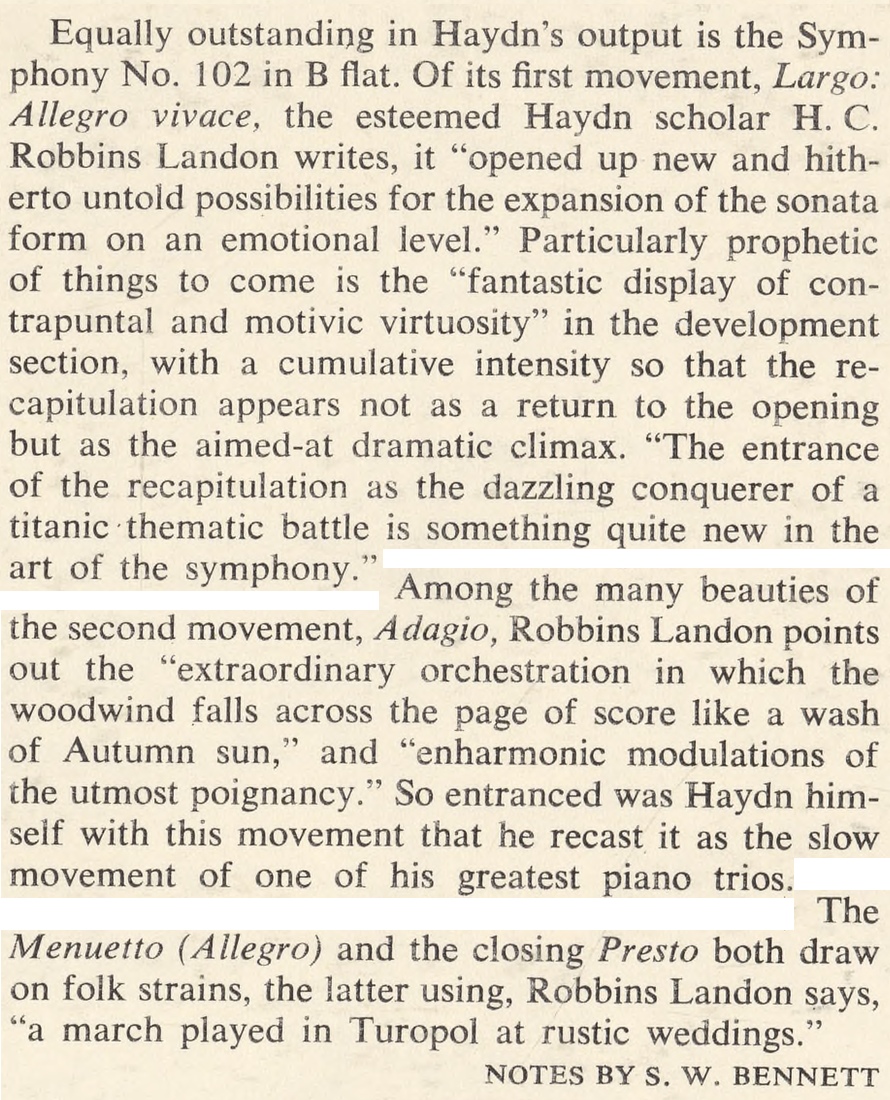 Joseph Haydn, Symphonie No 102 en si bémol majeur, Orchestre Symphonique de l'Opéra d'État de Vienne, Mogens Wöldike, juin 1956, Musikverein, Brahms-Saal, Wien