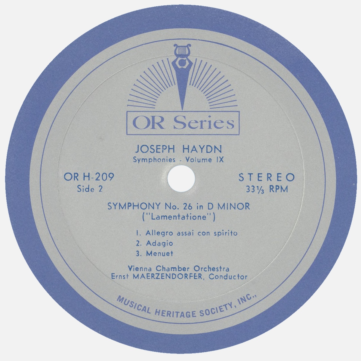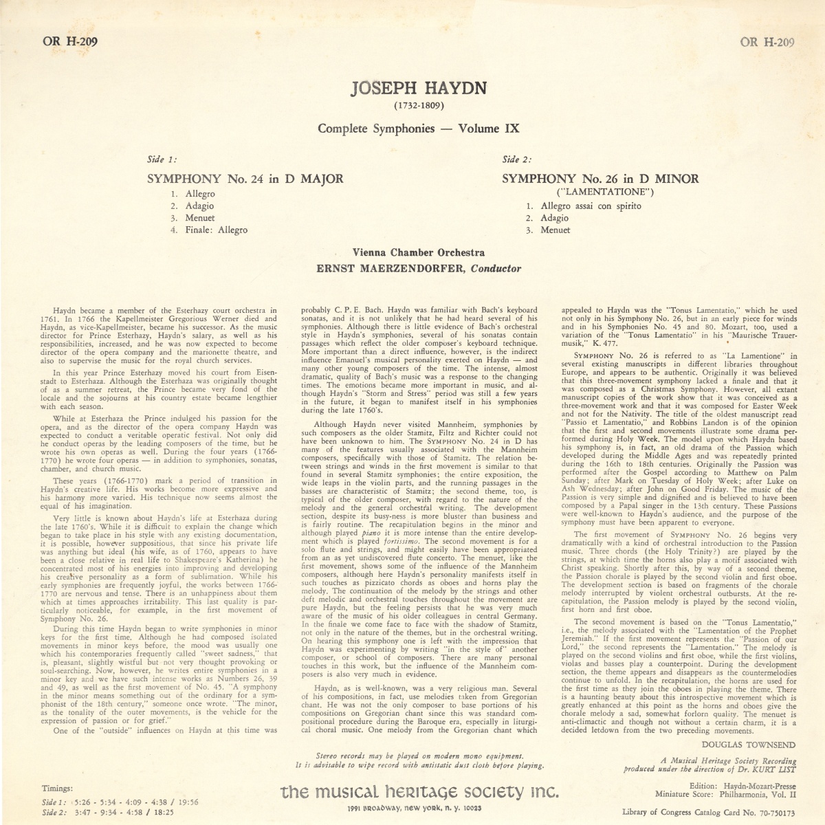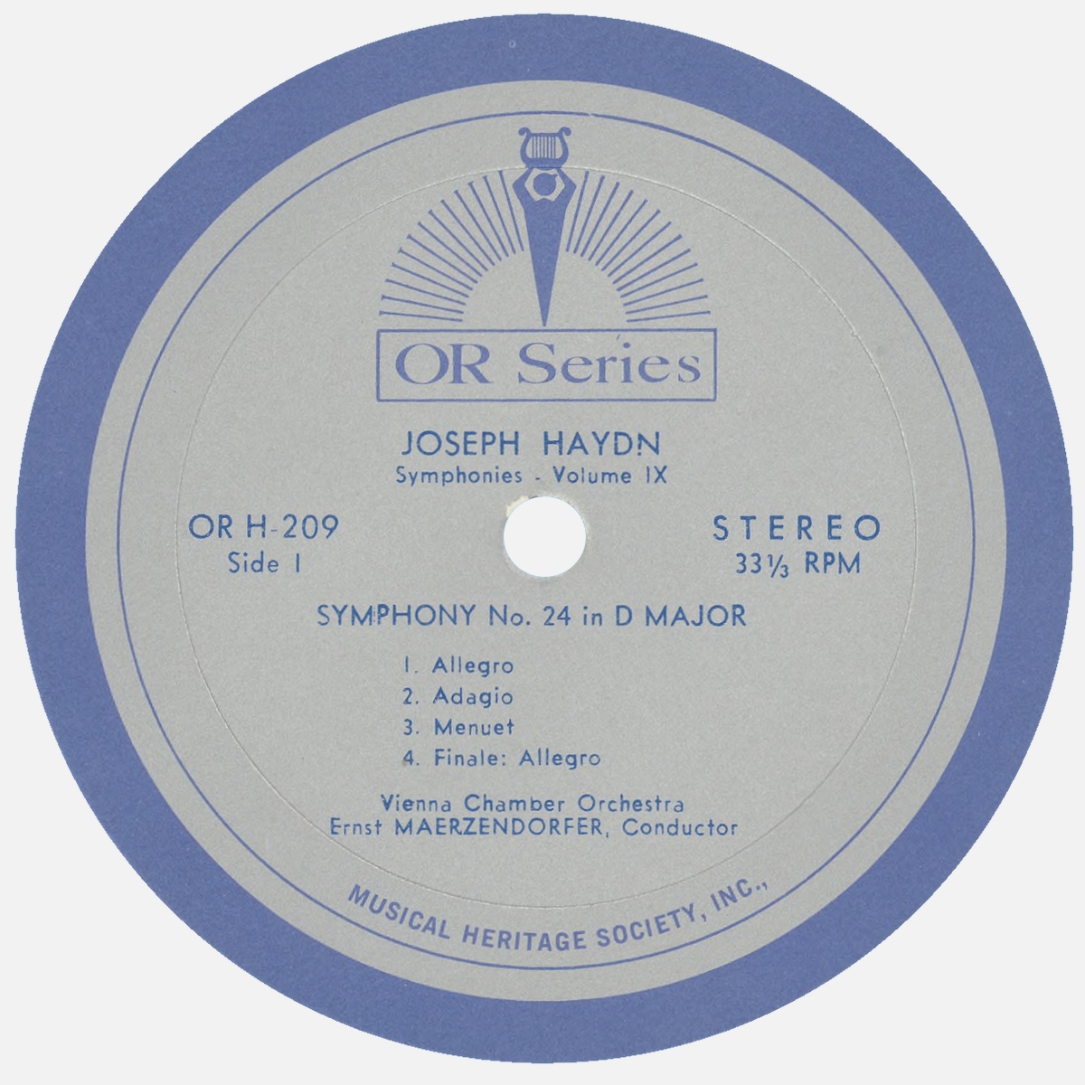 Dans les années 1960, Ernst MÄRZENDORFER enregistra l'intégrale des symphonies de Joseph Haydn avec l'Orchestre de chambre de Vienne (Wiener Kammerorchester) pour le label Musical Heritage Society. L'enregistrement présenté sur cette page fut publié sur le disque „OR Series“ (*), OR H-209, avec la symphonie No 24 sur la première face et la symphonie No 26 au verso.