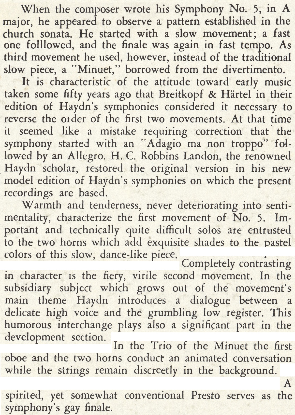 Voir également les notes de Karl GEIRINGER publiées au verso de la pochette du disque MHS Orpheus OR H-202. Ci-dessous, l'extrait concernant cette symphonie No 5: