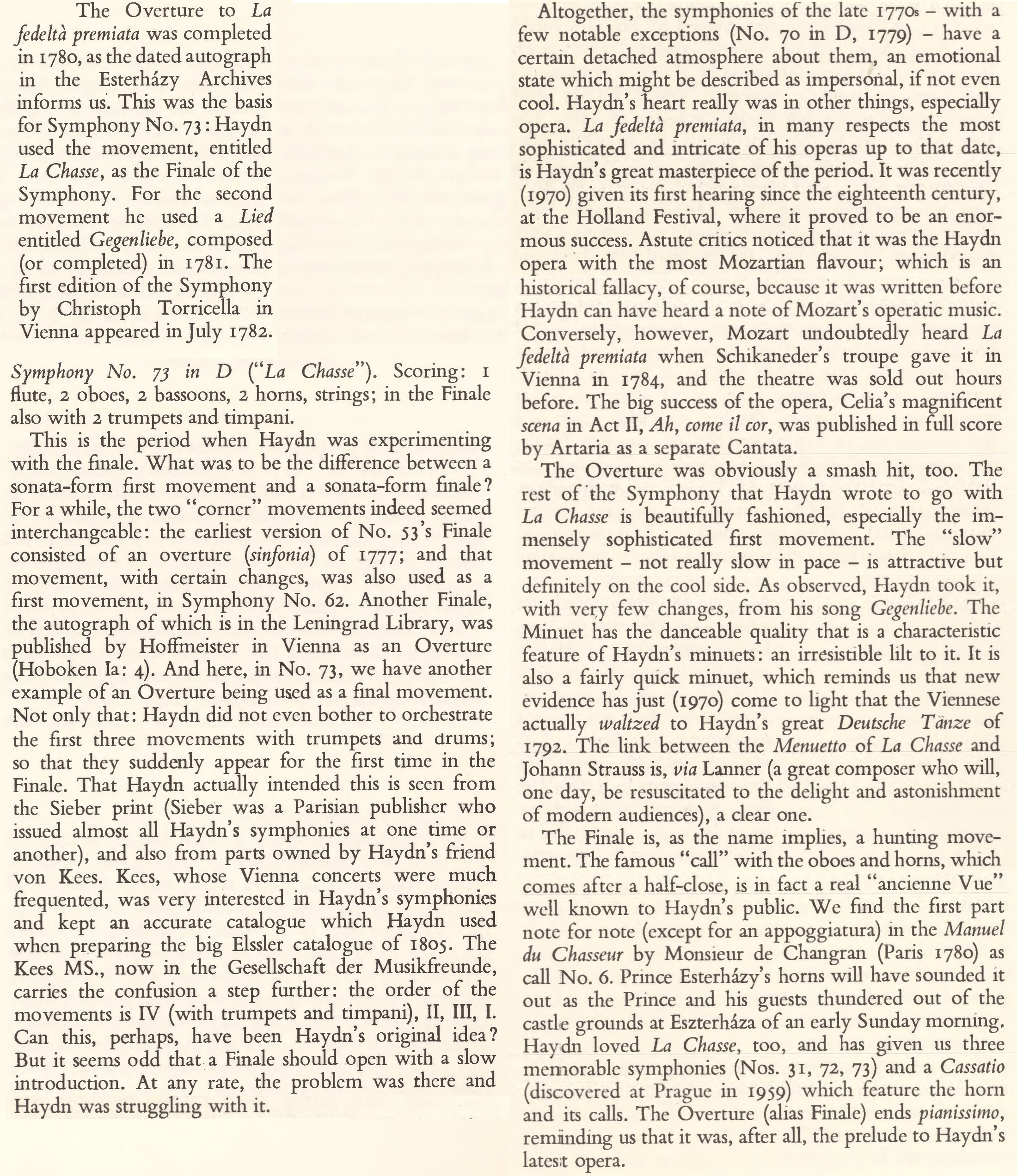 D'après les notes de H.C. Robbins Landon publiées en 1972 dans l'intégrale des symphonies de Haydn enregistrée par Antal Dorati avec la Philharmonia Hungarica, la symphonie No 73 date de 1781. L'excellente présentation de H.C. Robbins Landon: