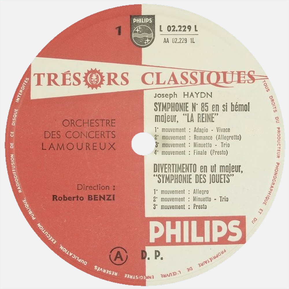 Joseph Haydn, Symphonie No 85 en si bémol majeur, HOB I:85, dite «La Reine», Orchestre Lamoureux, Roberto BENZI, 8 au 12 janvier 1962, Maison de la Mutualité, Paris