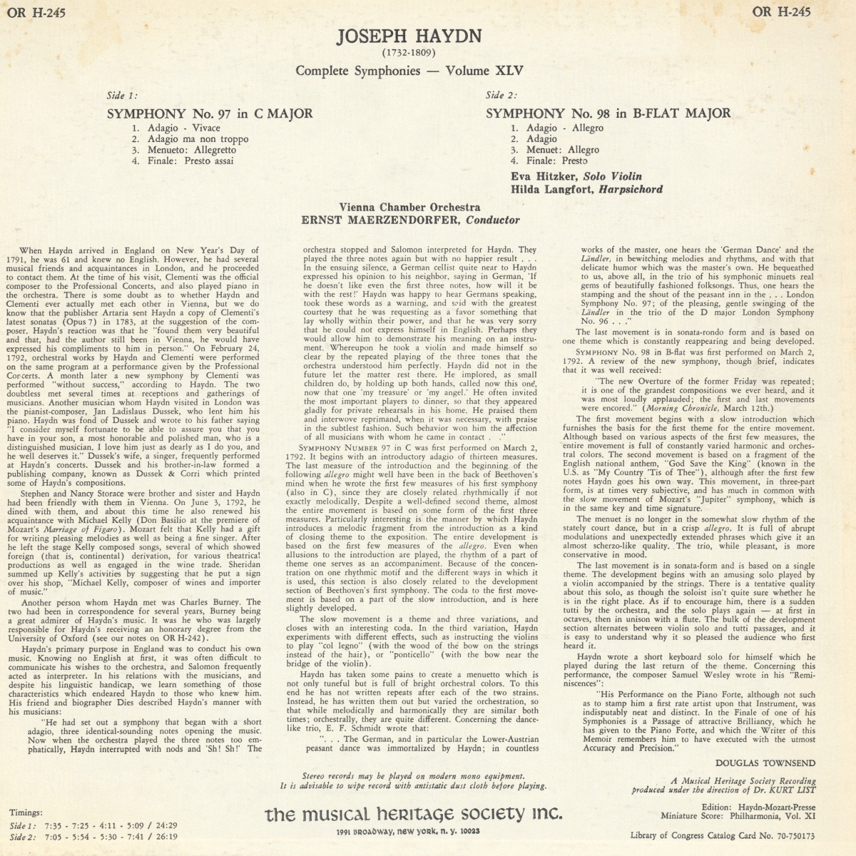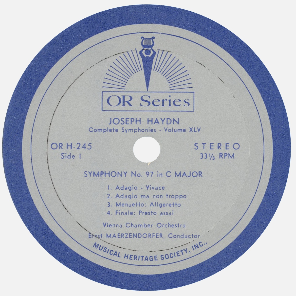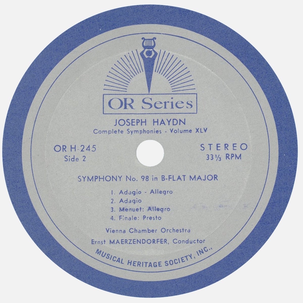 Dans les années 1960, Ernst MÄRZENDORFER enregistra l'intégrale des symphonies de Joseph Haydn avec l'Orchestre de chambre de Vienne (Wiener Kammerorchester) pour le label Musical Heritage Society. L'enregistrement présenté sur cette page fut publié sur le disque „OR Series“ (*), OR H-245, avec la symphonie No 97 sur la première face et la symphonie No 98 au verso.