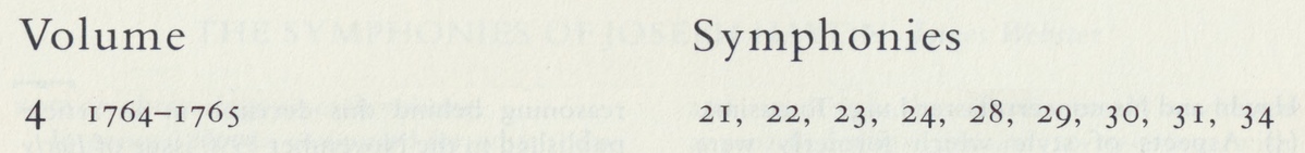 "[...] Des neuf symphonies présentées dans ce volume, huit furent composées en 1764 (Nos.21 à 24) et 1765 (Nos.28 à 31). La date de la No. 34 est incertaine (voir ci-dessous). (La No.39, écrite probablement en 1765 ou 1766, est inclue dans le Volume 5.) Leurs autographes, à l’exception d’un seul, appartinrent autrefois aux archives des Esterhâzy (ils sont aujourd’hui dans la section musicale de la Bibliothèque nationale Széchényi de Budapest), ce qui renforce la supposition, confirmée pour la plupart des symphonies que Haydn écrivit entre 1761 et 1780 environ, qu’elles furent composées pour le prince Esterhâzy et créées en sa présence — en l’occurence dans la salle de musique du château princier d’Eisenstadt (Burgenland, Autriche). Aucun indice précis ne permet d’affirmer que les symphonies de chaque groupe ont bien vu le jour dans l’ordre où elles figurent ici. À l’exception toutefois de la No.28 en La, dont l’autographe utilise en partie un papier de type différent, et que Haydn inclut un peu plus tard que les autres dans le catalogue thématique qu’il venait d’inaugurer; elle fut peut-être la dernière des symphonies de 1765 à être composée.