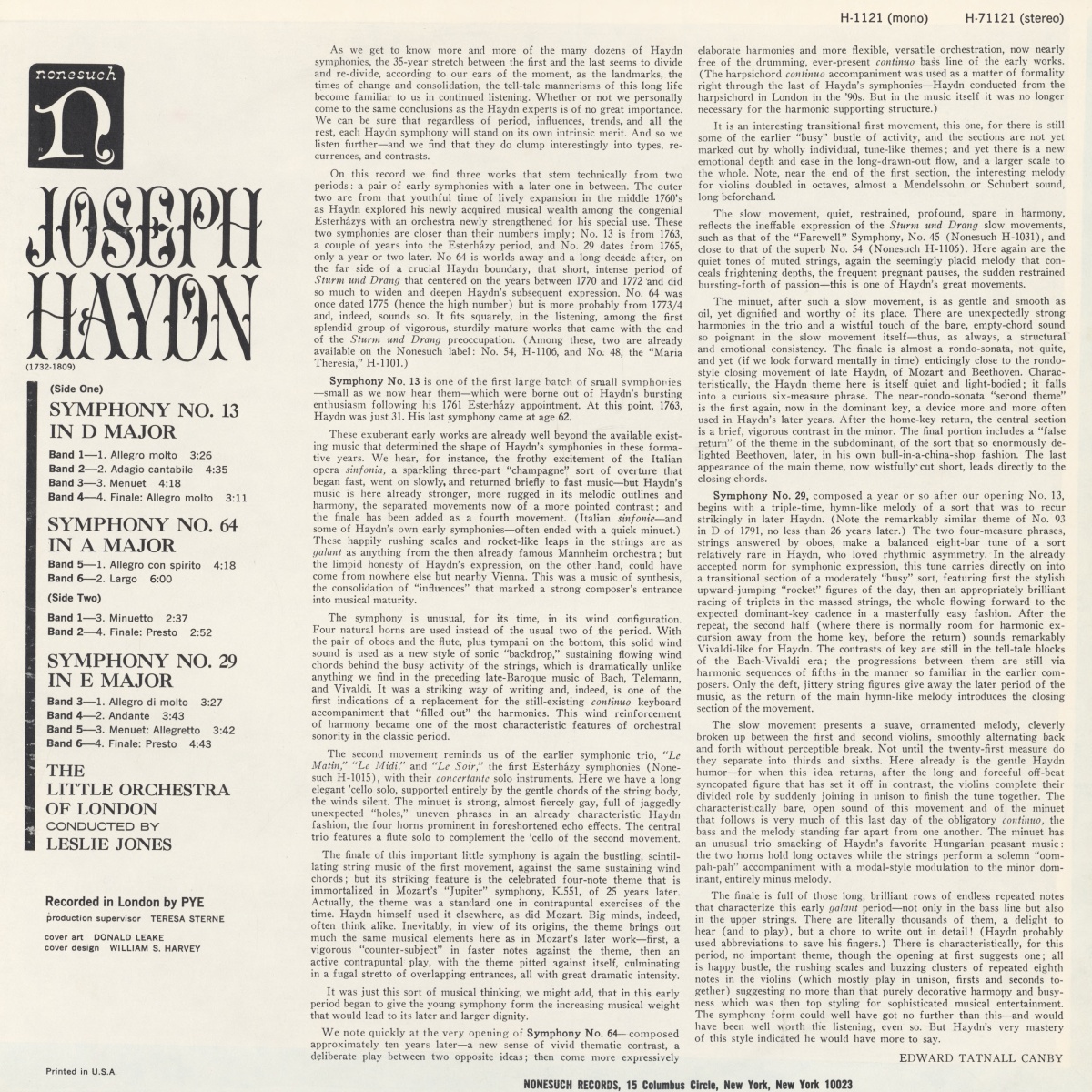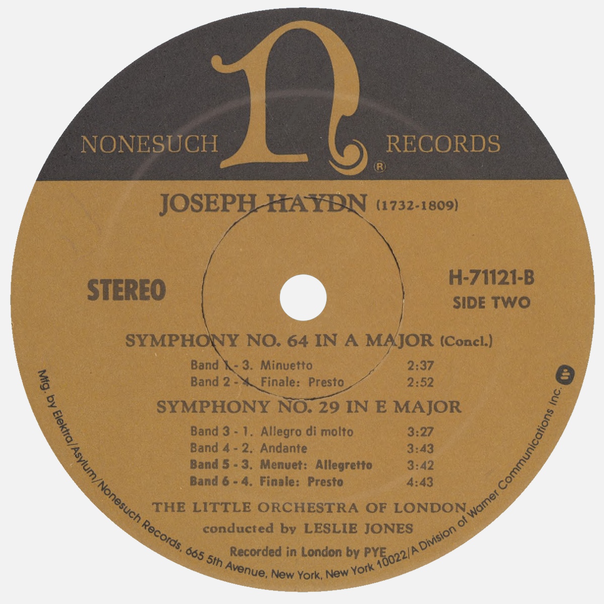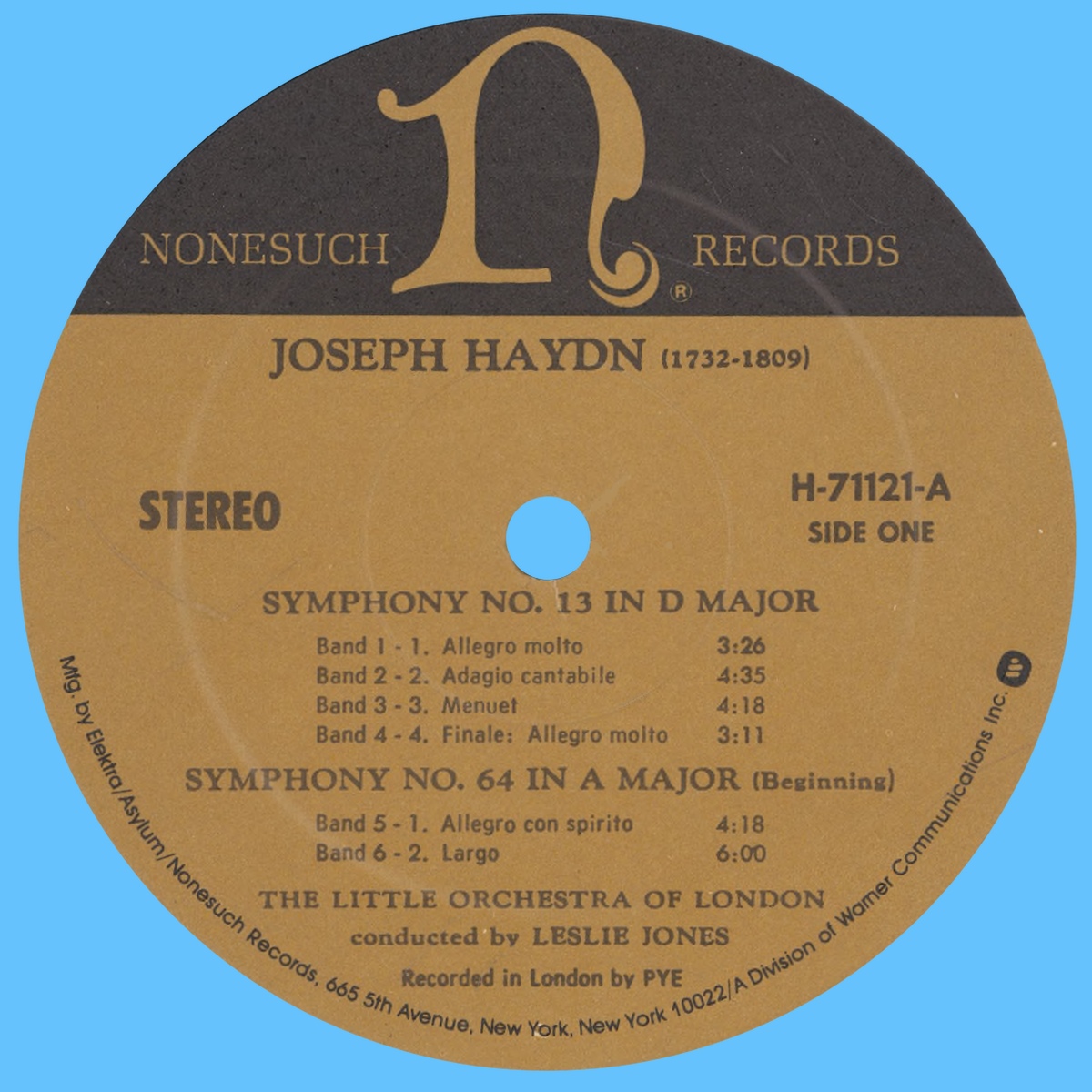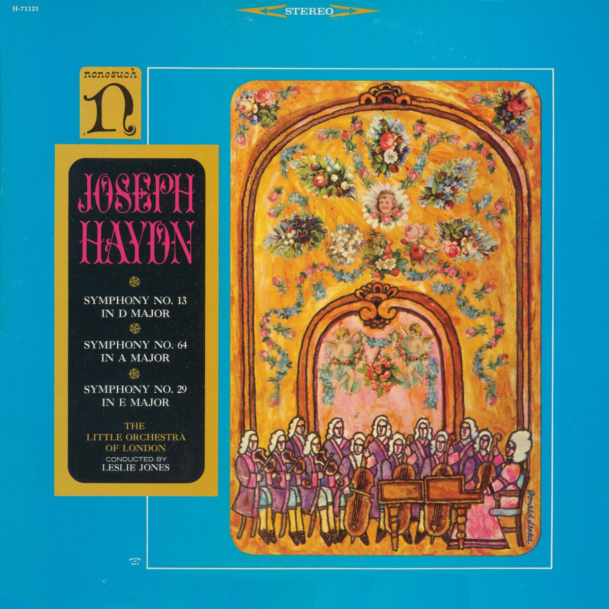 Dans les années 1960, Leslie JONES enregistra une cinquantaine des symphonies de Joseph Haydn avec son «Little Orchestra of London» - pour le label britannique Pye Records, et qui furent peu après rééditées aux USA par le label Nonesuch Records. L'enregistrement de la symphonie No 64 fut ainsi réédité en stéréo sur ce disque Nonesuch H 71121 (en mono sur Nonesuch H 1121), avec les symphonies No 13 et 29.
