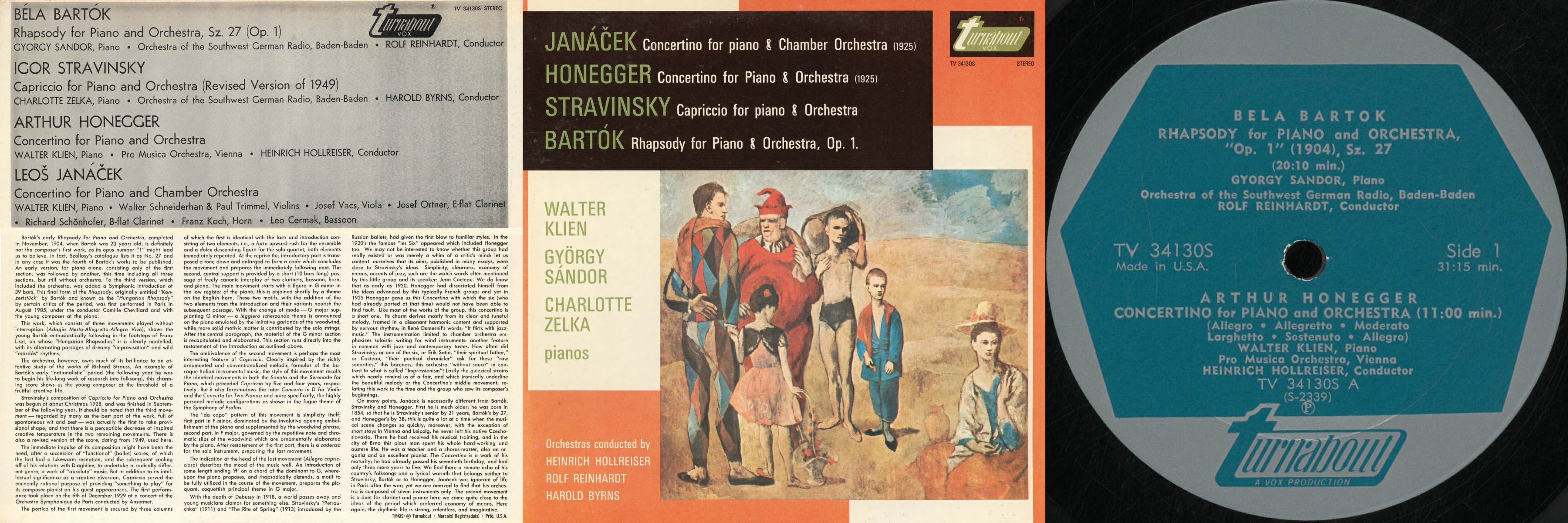 L'enregistrement du Concertino pour piano et orchestre, H 55, d'Arthur HONEGGER proposé en écoute sur cette page fut réalisé pour le label VOX, disques PL 10840 resp. STPL 510.840, puis réédité entre autres sur ce disque Turnabout TV 34130S - une prise de son faite le 25 juin 1959 dans la Grande salle du «Musikverein» de Vienne. Le soliste est Walter KLIEN , l'Orchestre Symphonique de Vienne étant dirigé par Heinrich HOLLREISER (sur les différentes éditions, l'orchestre est nommé „Pro Musica Wien“, mais selon la banque de données „A Classical Discography“ de Michael GRAY il s'agissait en réalité d'une formation de l'Orchestre Symphonique de Vienne).