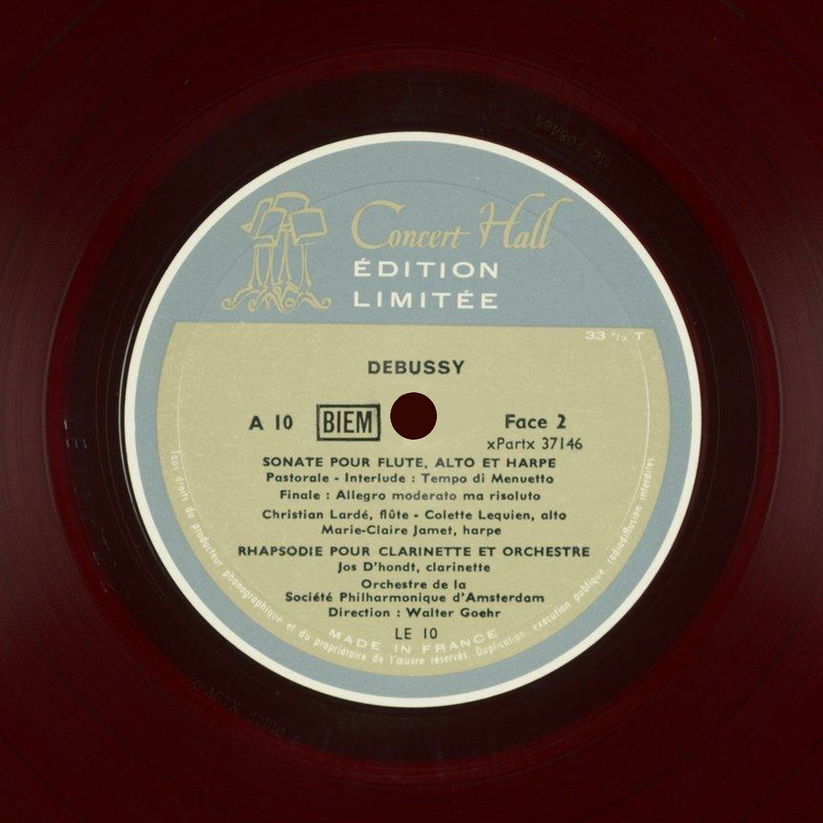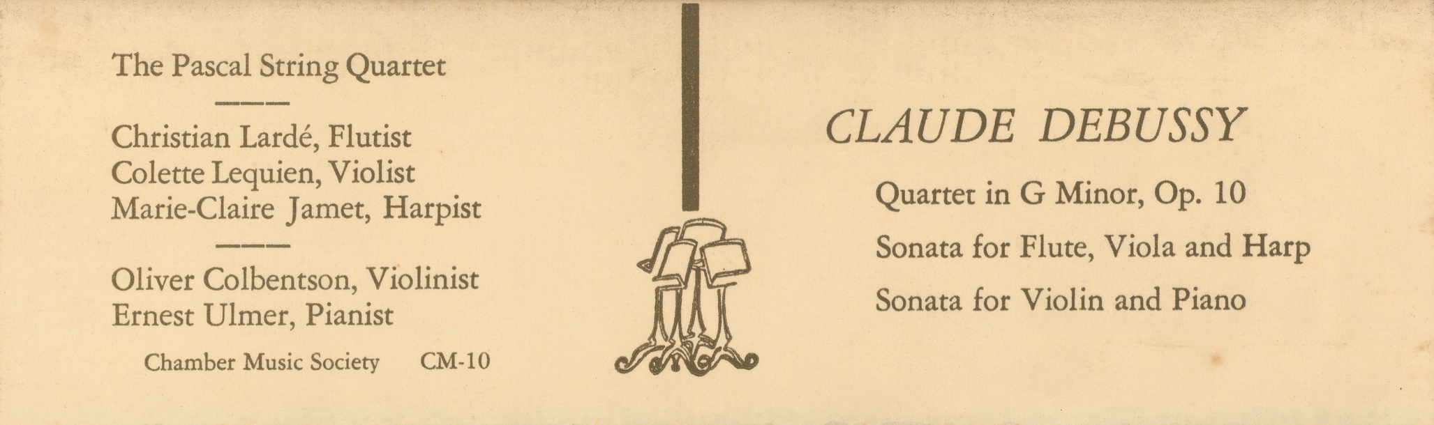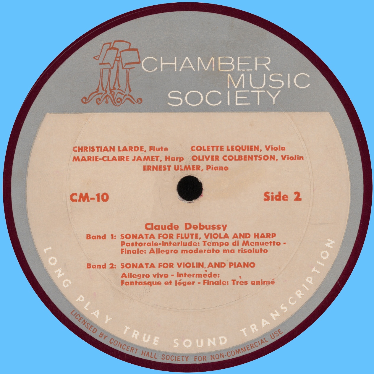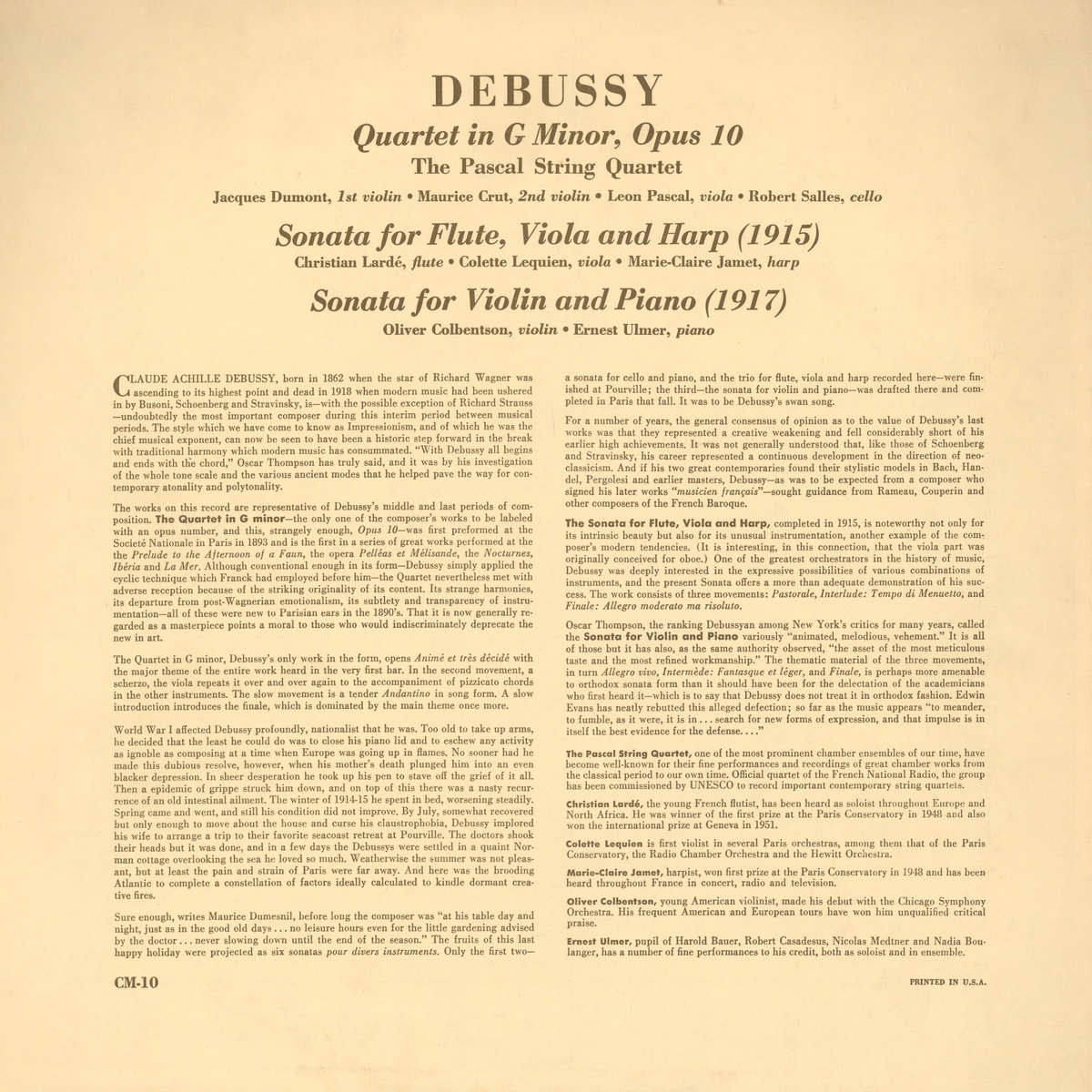 Ce disque «Chamber Music Society» CM-10 est entièrement consacré à Claude Debussy, avec au recto le Quatuor à cordes Op. 10, L 85, et au verso deux de ses dernières sonates: