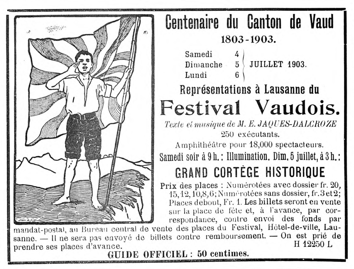 Beaucoup de Vaudois n'ont encore qu'une idée vague de ce que sera le Festival composé par M. Jaques-Dalcroze à la demande du comité du Centenaire. Quelques bribes d'informations publiées dans les journaux, quelques conférences de l'auteur devant un auditoire forcément restreint, ne suffisent pas à satisfaire la légitime curiosité publique. L'étude abrégée qui va suivre, si elle reste impuissante à évoquer le côté purement musical, donnera toutefois un aperçu d'ensemble assez net de cette vaste conception, à l'exécution de laquelle ne participeront pas moins de 2000 personnes venues de toutes les parties du canton.