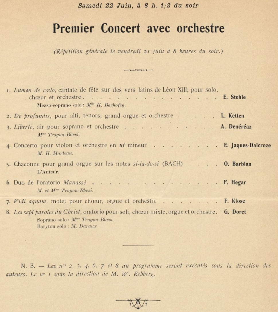 Le concerto No 1 fut donné en première audition à Genève lors de la 2e Fête de Musique 1901: