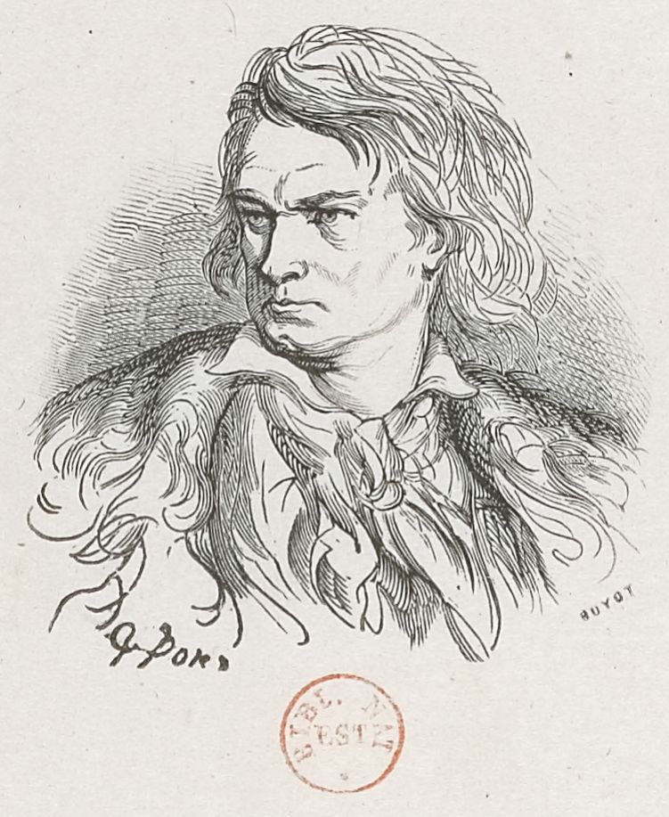 Ludwig van Beethoven, estampe de Gustave Doré (1832-1883), gravure d'Étienne Huyot (1807-1885). Date d'édition: 1860, gravure sur bois; 4,5 x 4,3 cm, Droits: domaine public, Identifiant: ark:/12148/btv1b10319403r, Source: Bibliothèque nationale de France, département Estampes et photographie, FOL-DC-298, Notice d'ensemble, Notice de recueil - Appartient à: [Recueil. Oeuvre de Gustave Doré. Oeuvre monté. Tome 18, Taine, "Voyage aux Pyrénées" (1860) (II); Vincent et Plouvier, "Refrains du dimanche" (1856); L'Épine, "La légende du Croque-mitaine" (1863 et 1874); pièces non identifiées], Notice du catalogue