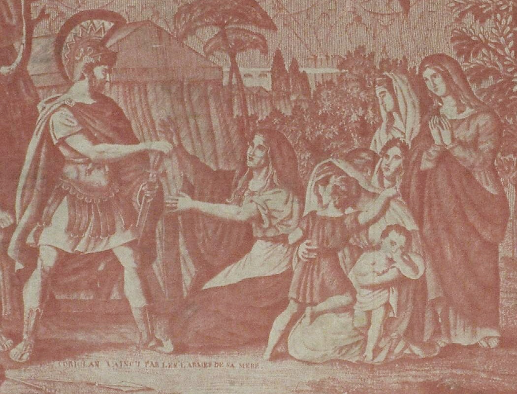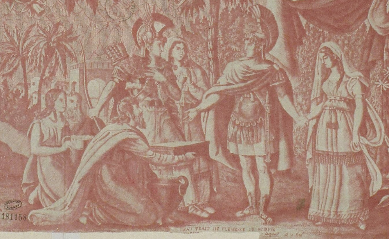 Extrait de la toile imprimée «Coriolan et Scipion» d'Alexandre Buquet, dessinateur et graveur, Rouen: Manufacture Bapaume et Cocatrix ?, ca 1820, Source: Ville de Paris / Bibliothèque Forney, Lien permanent sur la toile complète. Deux scènes sont illustrées et légendées: «Coriolan vaincu par les larmes de sa mère» (ci-dessus) et «beau trait de clémence de Scipion» (ci-dessous). Sous cette dernière apparaît la signature «Buquet D. et Scul.». La scène de Coriolan reprend un dessin de Barbier l'Aîné ( 1738-1826), daté de 1788 et gravé par son élève J.J. Avril ( source : X.Petitcol). Deux gravures au burin de Chasselat publiées à Paris chez Bulla, "Scipion l'Africain à Carthagène" et Coriolan vaincu par les larmes de sa mère"ont inspiré la toile.