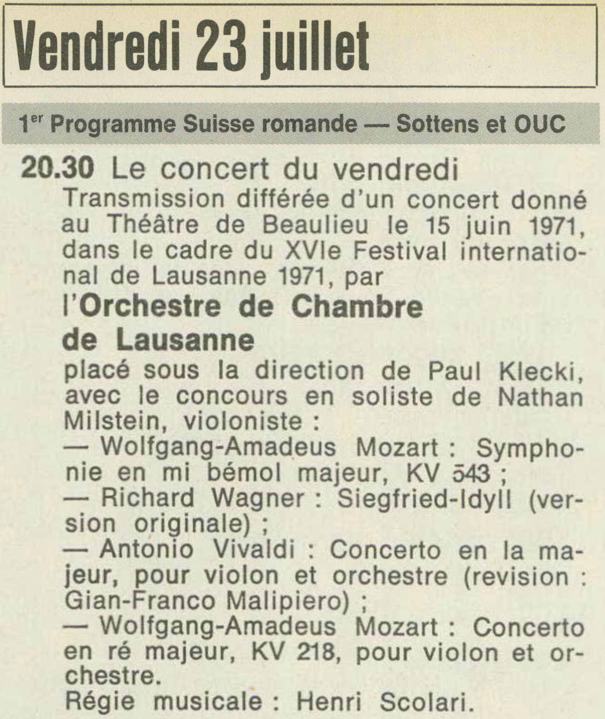 Le grand violoniste Nathan Milstein a interprété en seconde partie un adorable «Concerto» (en la) de Vivaldi, qui ménage de splendides fioritures baroques au soliste, et le «Concerto en ré» de Mozart. Un son très fin, un brio instrumental étonnant, un dynamisme impulsif rachètent chez Milstein ce que l’expression peut avoir d’un peu léger: de même dans le bis qu’il aime toujours à servir, avec une incroyable virtuosité: l’«Allegro» initial de la «Partita en mi» pour violon seul de Bach. [...]"
