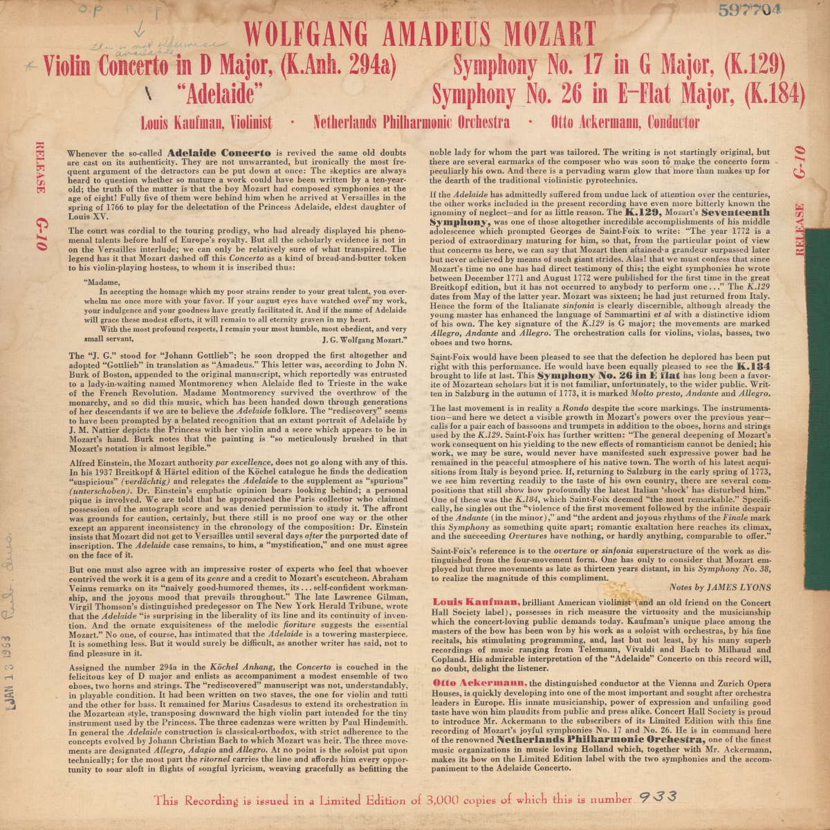 Wolfgang Amadeus Mozart / Marius Casadesus, Concerto pour violon et orchestre en ré majeur, KV Anh. 294a / KV Anh. C 14.05, dit «Concerto Adélaïde», Louis Kaufman, violon, Netherlands Philharmonic Orchestra, Otto Ackermann, 22 juillet 1952, Église Néo-Apostolique de Hilversum