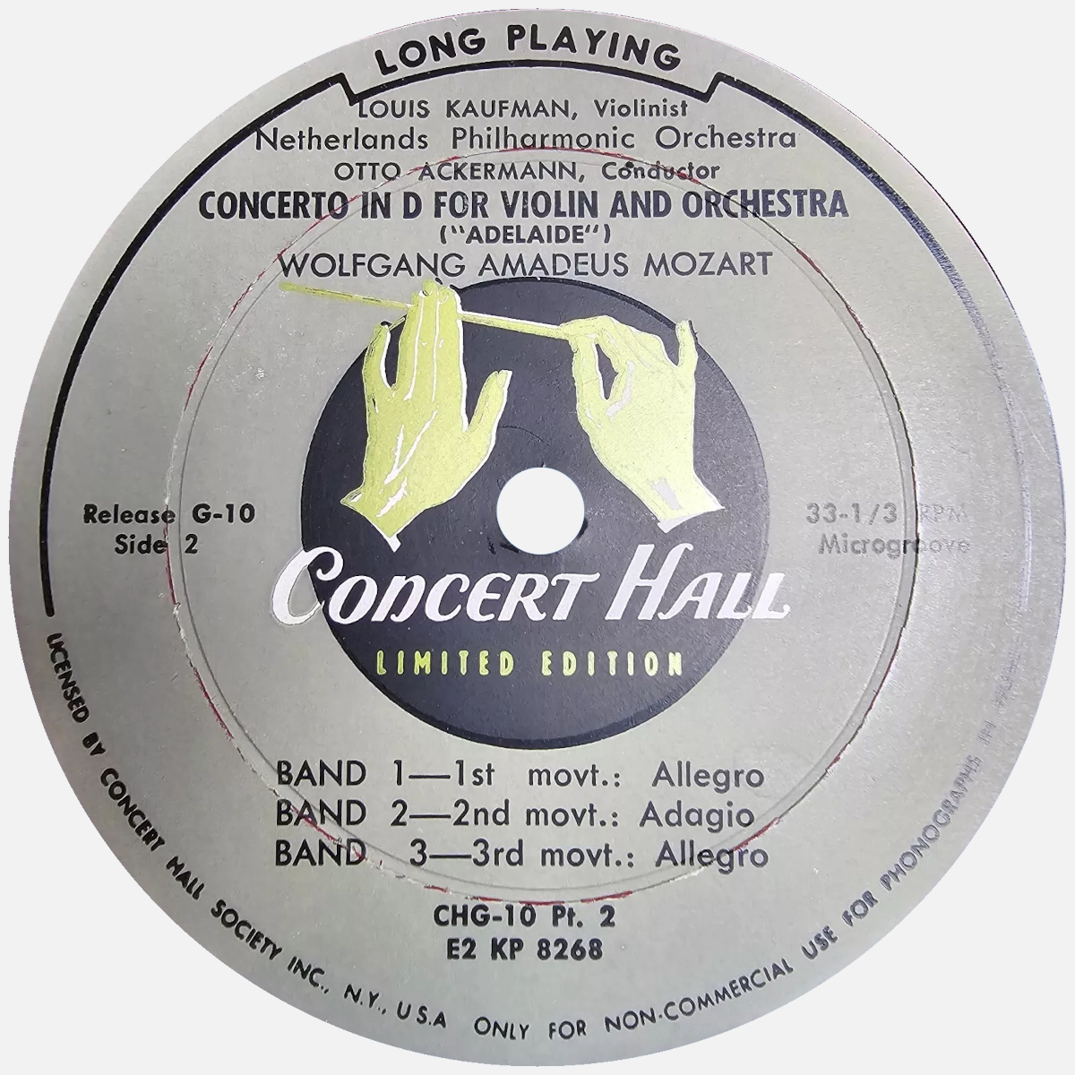 Dans cet enregistrement fait pour le label Concert Hall le 22 juillet 1952 dans l'Église Néo-Apostolique de Hilversum (*), Louis KAUFMAN est accompagné par un orchestre nommé «Netherlands Philharmonic Orchestra» (**) placé sous la direction d'Otto Ackermann.