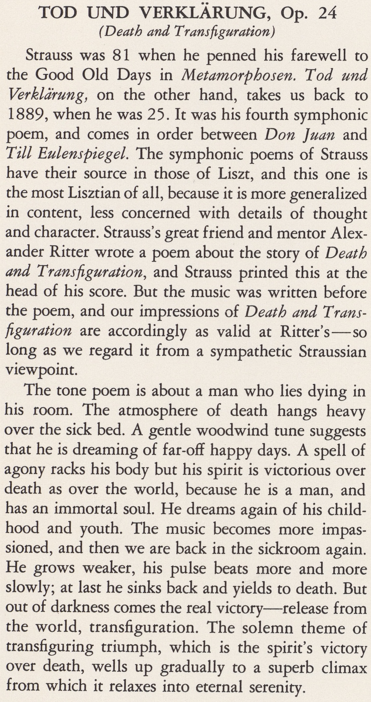 „Mort et Transfiguration“ - «Tod und Verklärung» - fut composé au cours de la décennie qui vit la naissance des grands poèmes symphoniques inspirés à Richard Strauss par des arguments littéraires, poétiques et philosophiques d'origines variées.