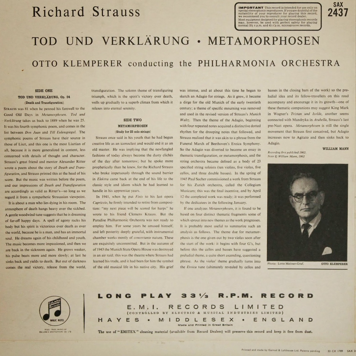 Verso de la pochette du disque Columbia SAX 2437