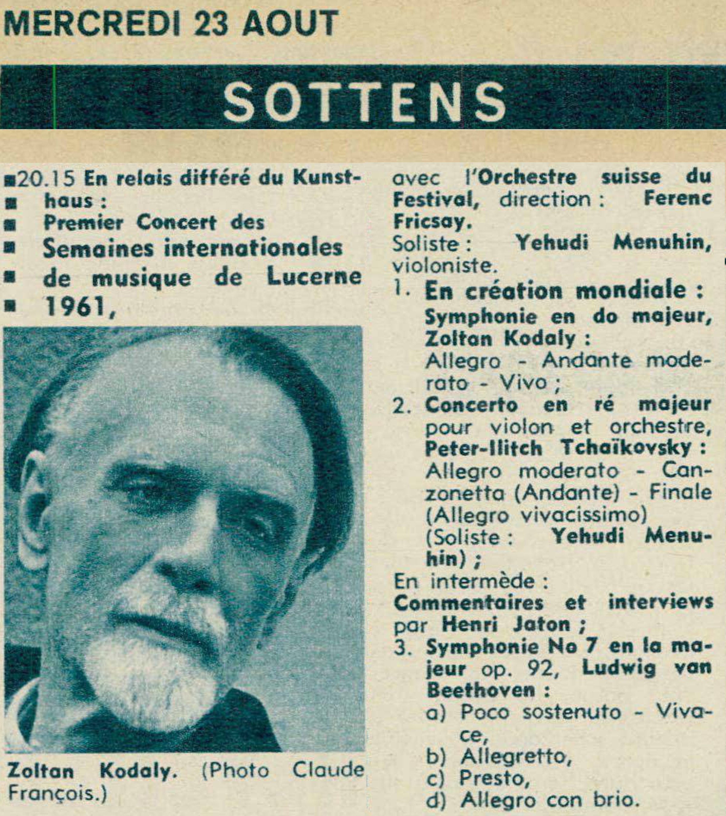 "[...] Respectueux de la forme de la symphonie classique, Zoltan Kodaly n'en a pas moins revivifié son cadre original, en usant d'éléments mélodiques et rythmiques où se retrouve la manière caractéristique du musicien. Celui-ci, présent au Kunsthaus, put recueillir le vibrant témoignage d'un auditoire littéralement enchanté et conquis. [...]" Henri JATON