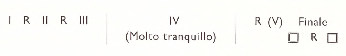 Sur la base de ce qui précède, nous pouvons esquisser la structure sous-jacente de la „Suite de danses“ (les chiffres romains désignent les mouvements, et R les ritournelles)