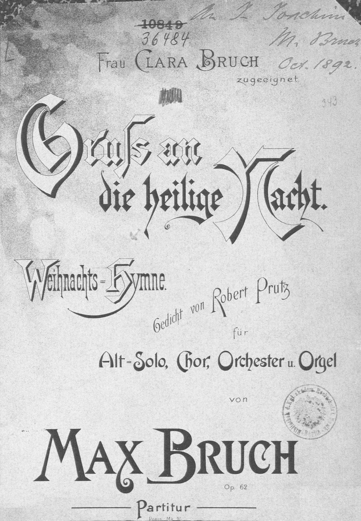 Max Bruch composa cet hymne de Noël en 1892, sur un poème de Robert Prutz. Ses cinq strophes alternent entre choeur et alto solo dans cette oeuvre de grande envergure, caractérisée par une harmonie romantique. Max Bruch aimait beaucoup le son chaud et riche de l'accompagnement orchestral, que l'on ressent également dans la version pour piano.