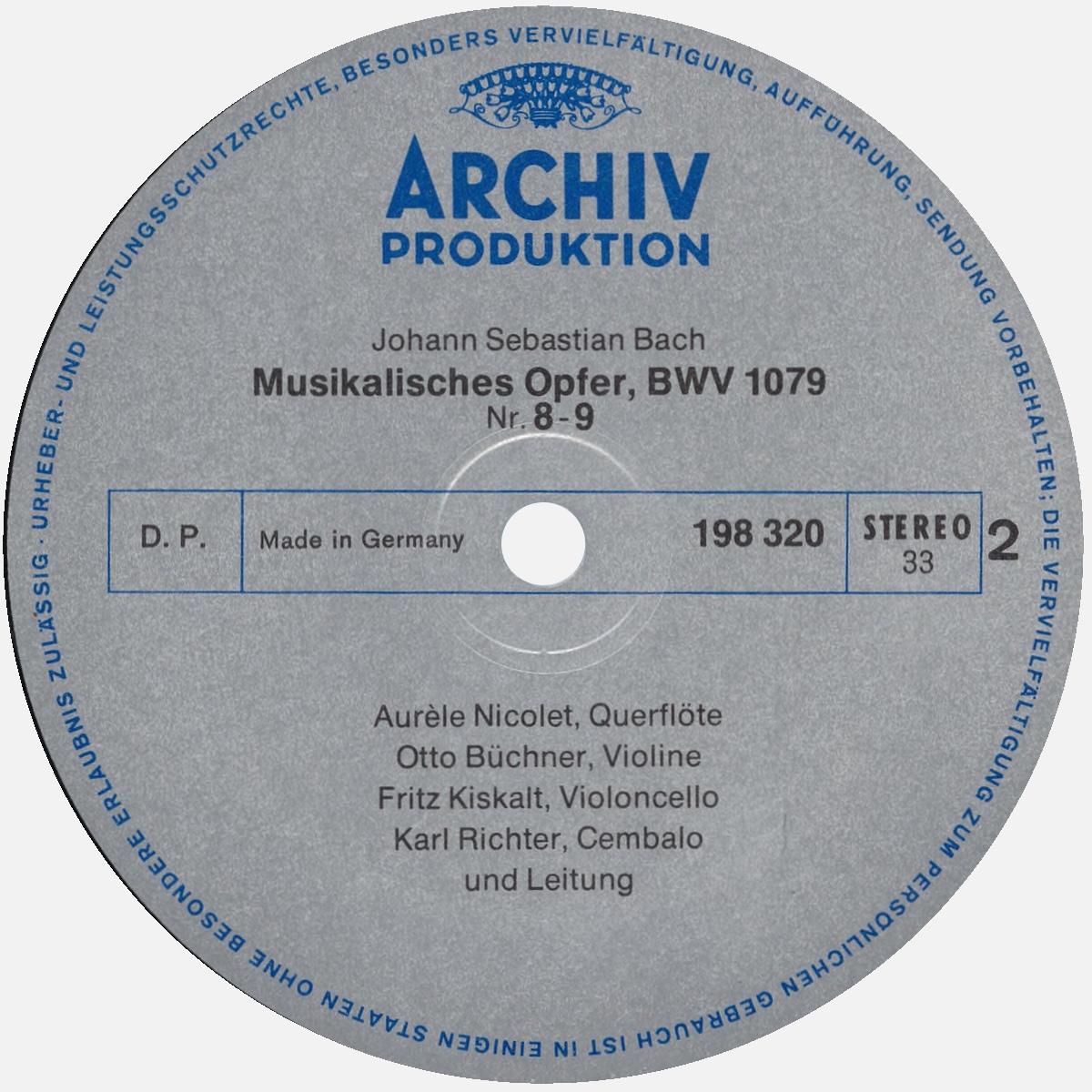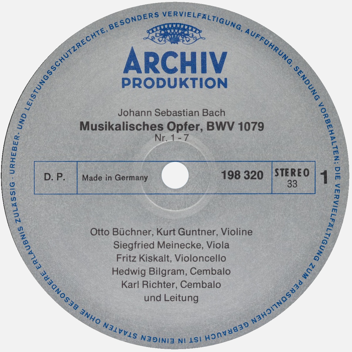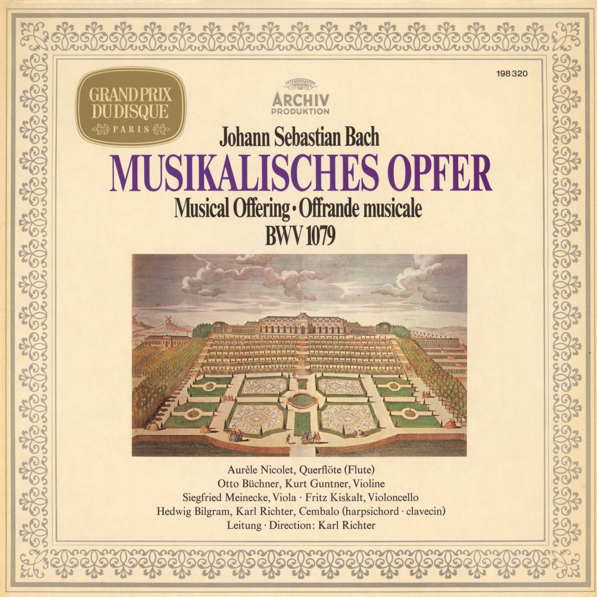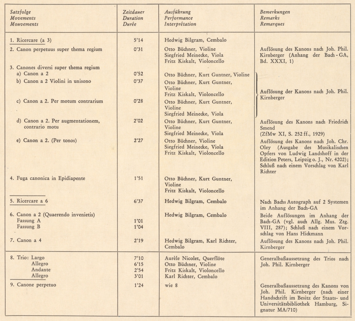 Publiée sur ce disque Archiv Produktion 198 320, l'interprétation de l'Offande Musicale de Johann Sebastian Bach que je vous propose sur cette page fut enregistrée du 17 au 21 janvier 1963 sous la direction de Karl RICHTER avec un ensemble instrumental composé de Aurèle NICOLET, flûte, Hedwig BILGRAM, clavecin, Otto BÜCHNER et Kurt GUNTNER, violons, Siegfried MEINECKE, alto, Fritz KISKALT, violoncelle, Karl RICHTER étant en plus au 2e clavecin dans le canon terminant la IIe partie de l'oeuvre (No 7), ainsi qu'au clavecin dans la IIIe partie (No 8 et 9). Le détail des différentes pièces: