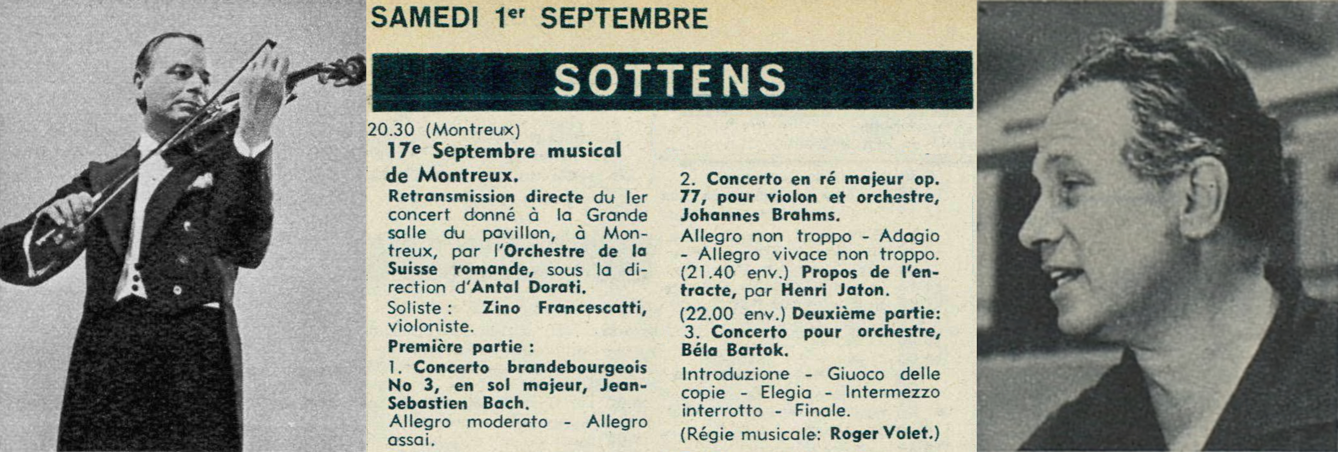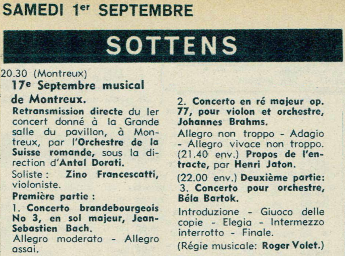 "[...] Avec Antal Doráti, Zino Francescatti et l’OSR, le XVIIe SEPTEMBRE MUSICAL DE MONTREUX débute dans une ivresse de joie et d’enthousiasme.