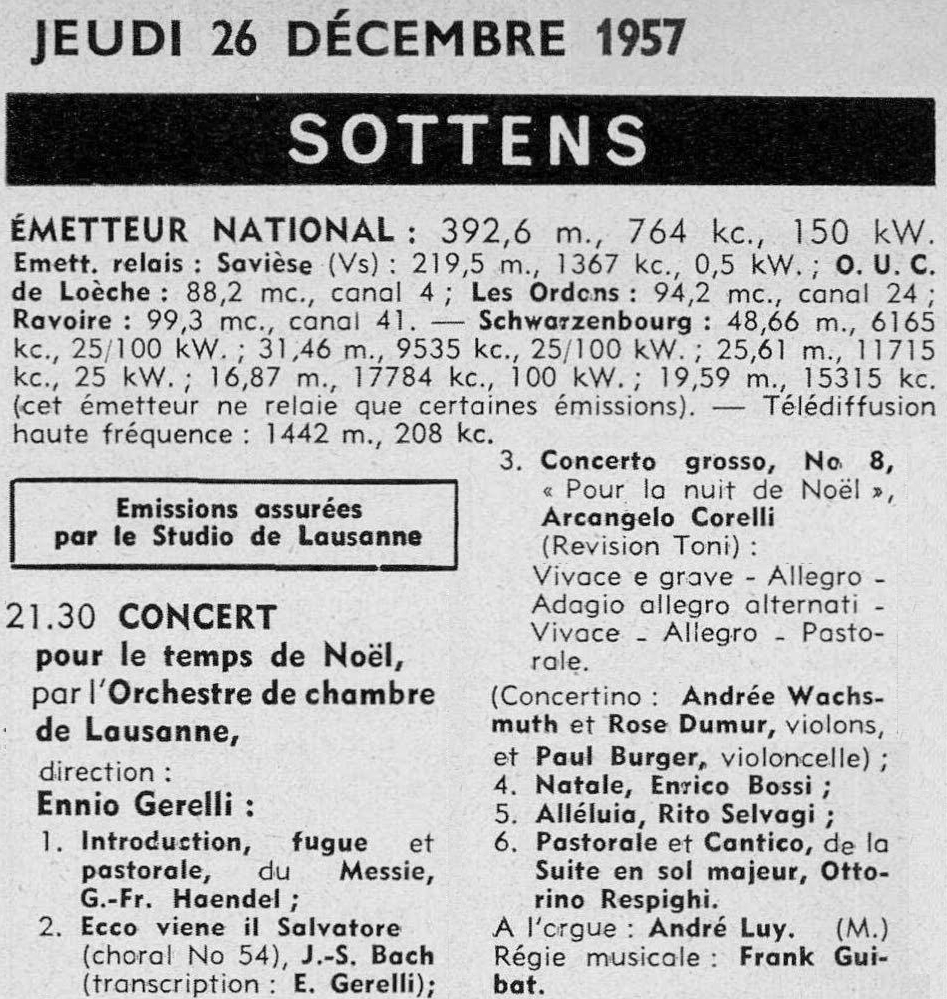 En (décembre?) 1957 Ennio GERELLI était invité à diriger l'Orchestre de Chambre de Lausanne pour un concert diffusé le 26 décembre 1957: je n'ai pas encore pu trouver si ce concert fut diffusé en direct, ou en différé.