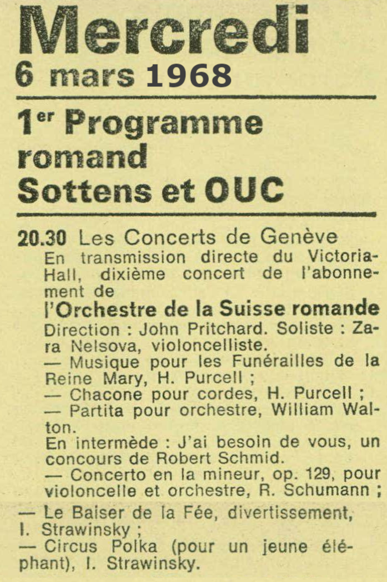 Robert Schumann, Concerto pour violoncelle en la mineur, op. 129, Zara Nelsova, violoncelle, Orchestre de la Suisse Romande, John Pritchard, 6 mars 1968, Victoria Hall, Genève