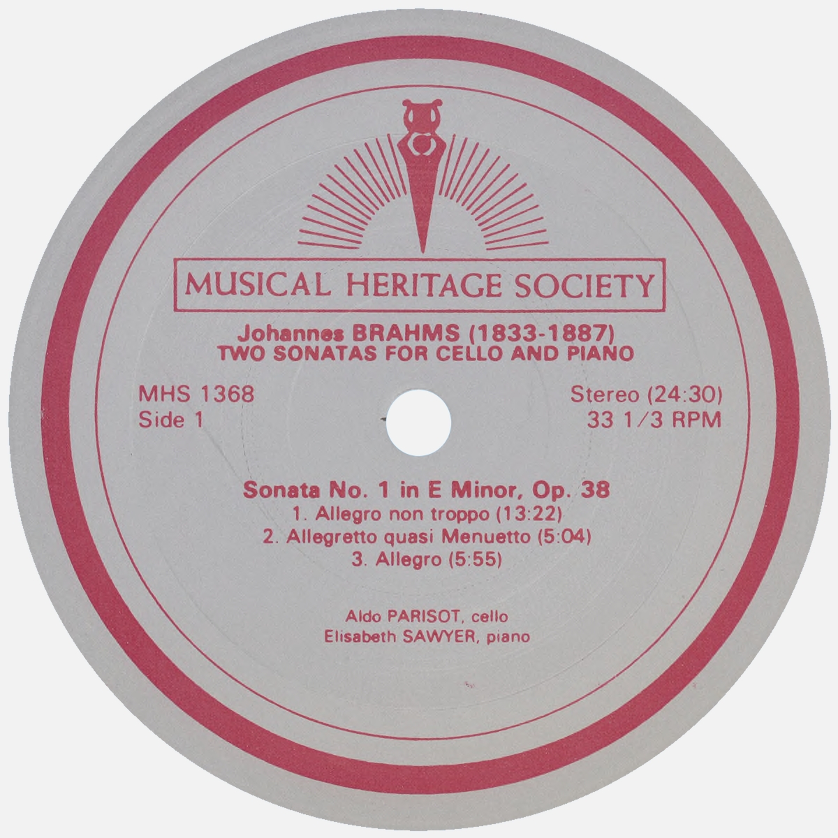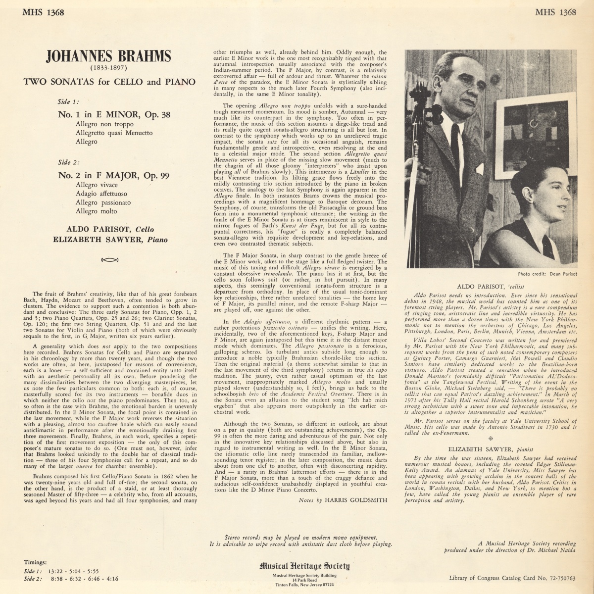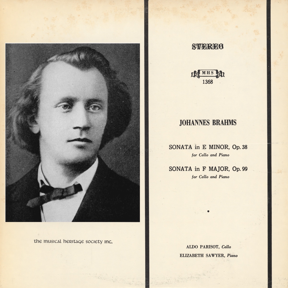 Vers la fin des années 1960 - ou, au plus tard, au tout début des années 1970 (d'après son numéro de contrôle de la Bibliothèque du Congrès aux États-Unis ce disque „The Musical Heritage Society“ MHS 1368 fut publié en 1972) - Aldo PARISOT, violoncelle, et Elisabeth SAWYER, piano, enregistrèrent les deux sonates pour violoncelle et piano de Johannes BRAHMS: