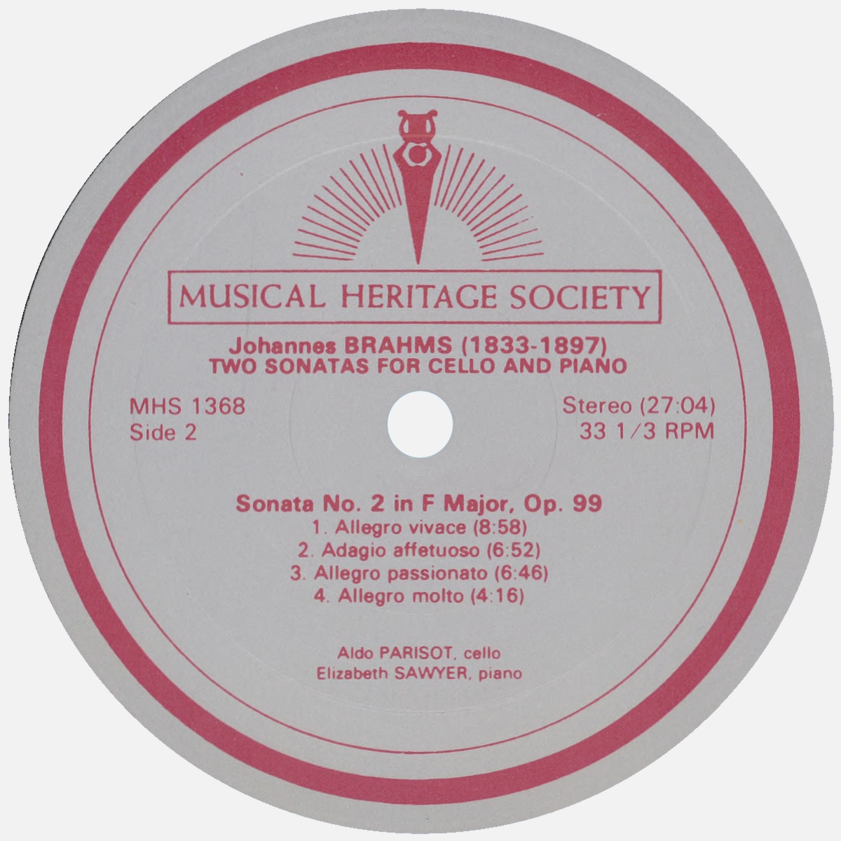 Vers la fin des années 1960 - ou, au plus tard, au tout début des années 1970 (d'après son numéro de contrôle de la Bibliothèque du Congrès aux États-Unis ce disque „The Musical Heritage Society“ MHS 1368 fut publié en 1972) - Aldo PARISOT, violoncelle, et Elisabeth SAWYER, piano, enregistrèrent les deux sonates pour violoncelle et piano de Johannes BRAHMS: