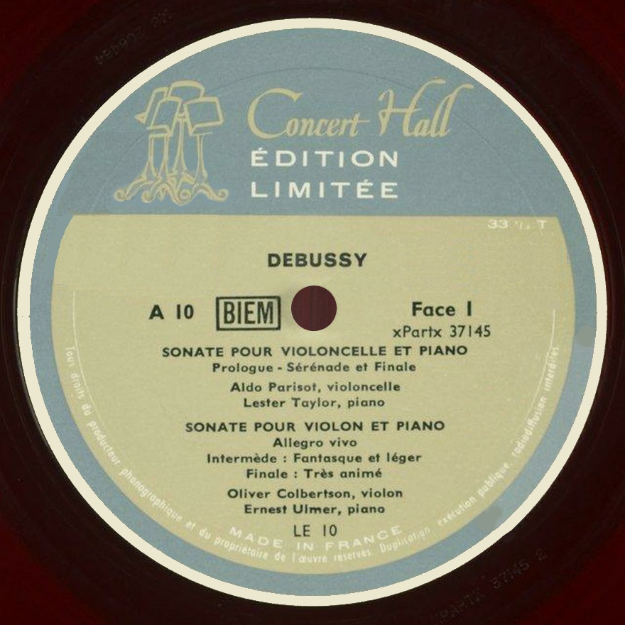 ➣ au recto cette Sonate pour violoncelle et piano, L 135, et la Sonate pour violon et piano en sol mineur, L 140 (dans l'interprétation d'Oliver Colbentson et Ernest Ulmer, parue auparavant sur le disque «Chamber Music Society» CM-10)