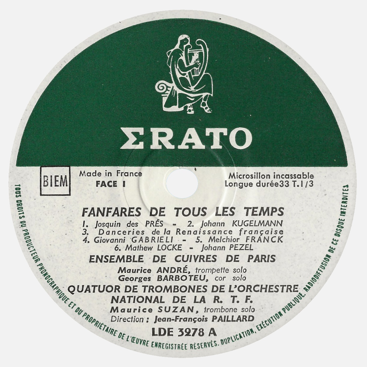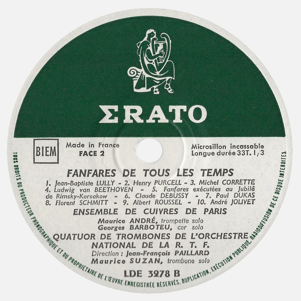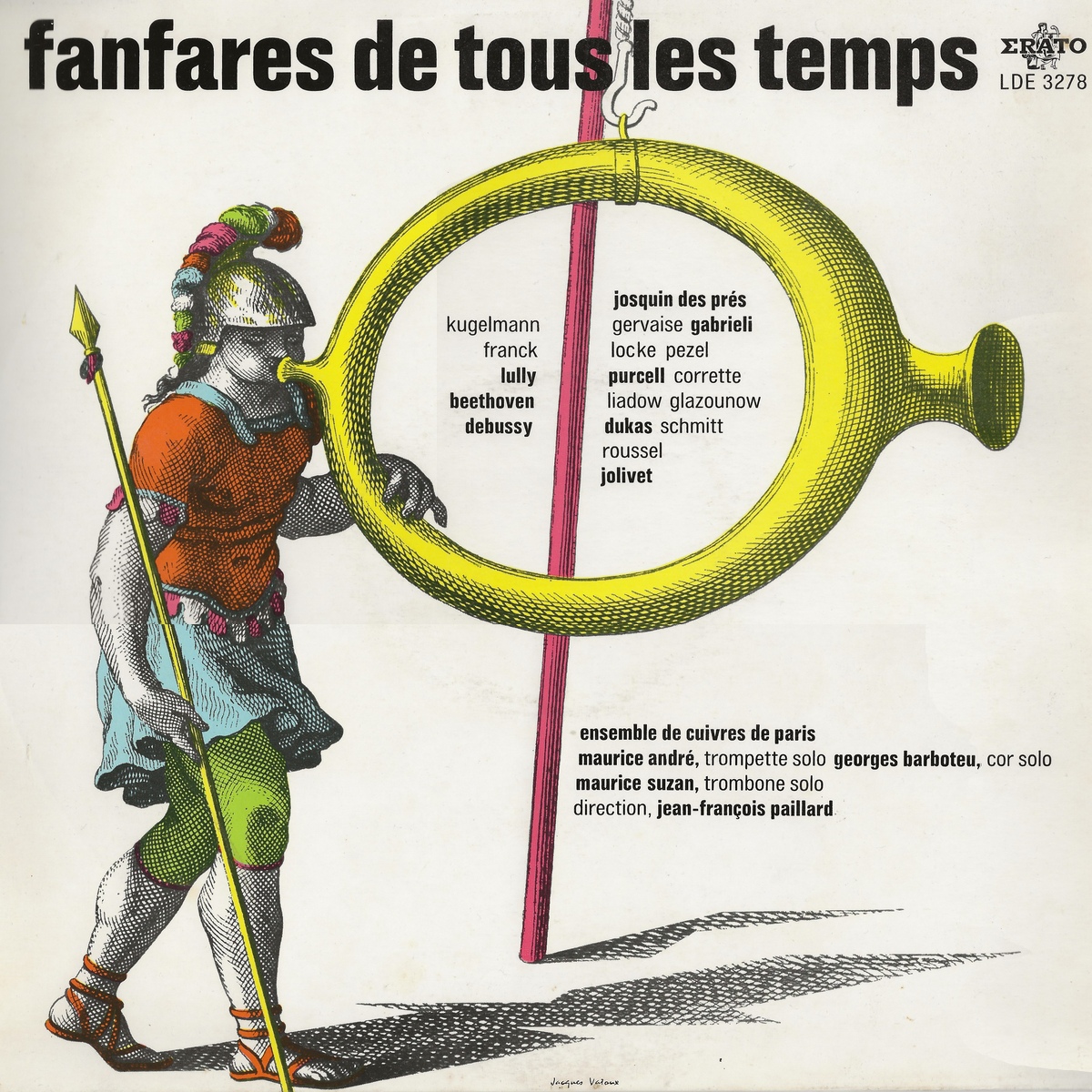Fanfares de tous les temps, Maurice André, trompette solo, Georges Barboteu, cor solo, Maurice Suzan, trombone solo, Jacques Rémy, timbales, Ensemble de Cuivres de Paris, Quatuor de Trombones de l'orchestre de la RTF, Jean-François Paillard, 24 et 26 juin 1963, Église Saint Michel des Batignolles, Paris