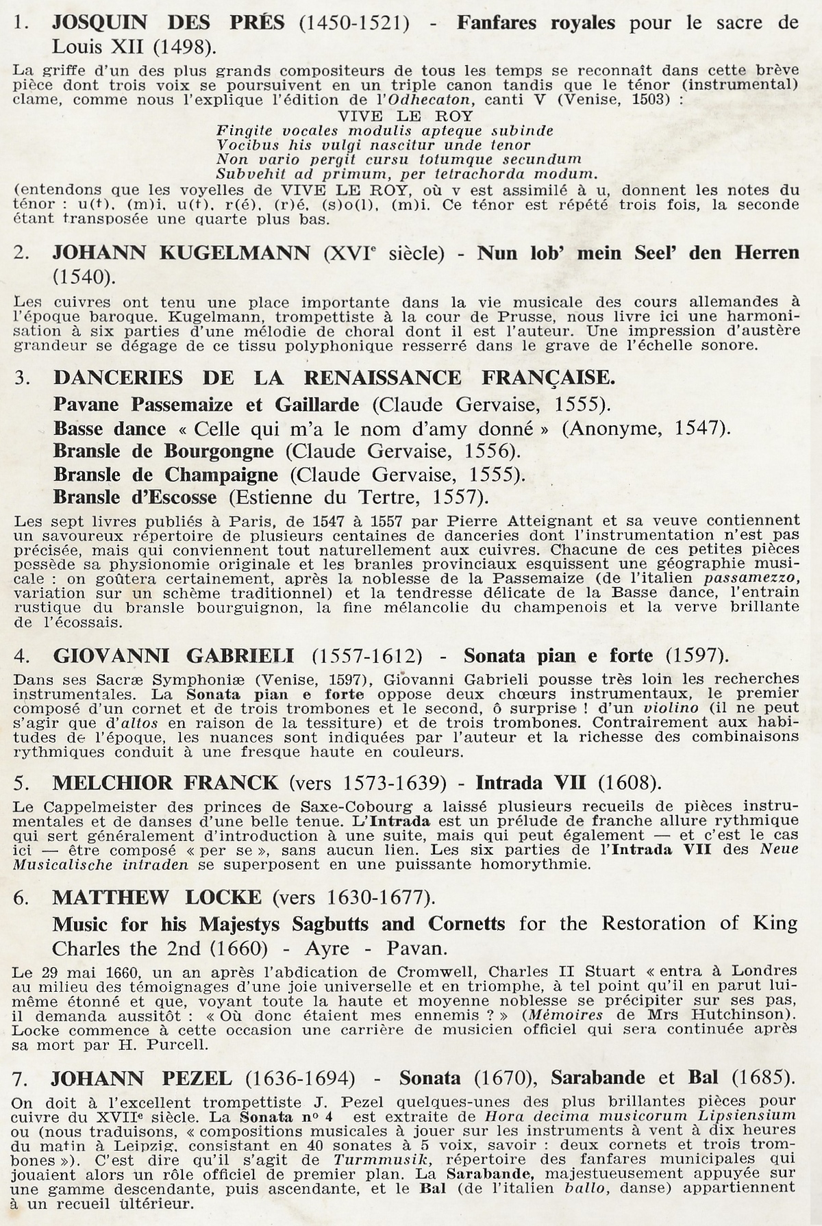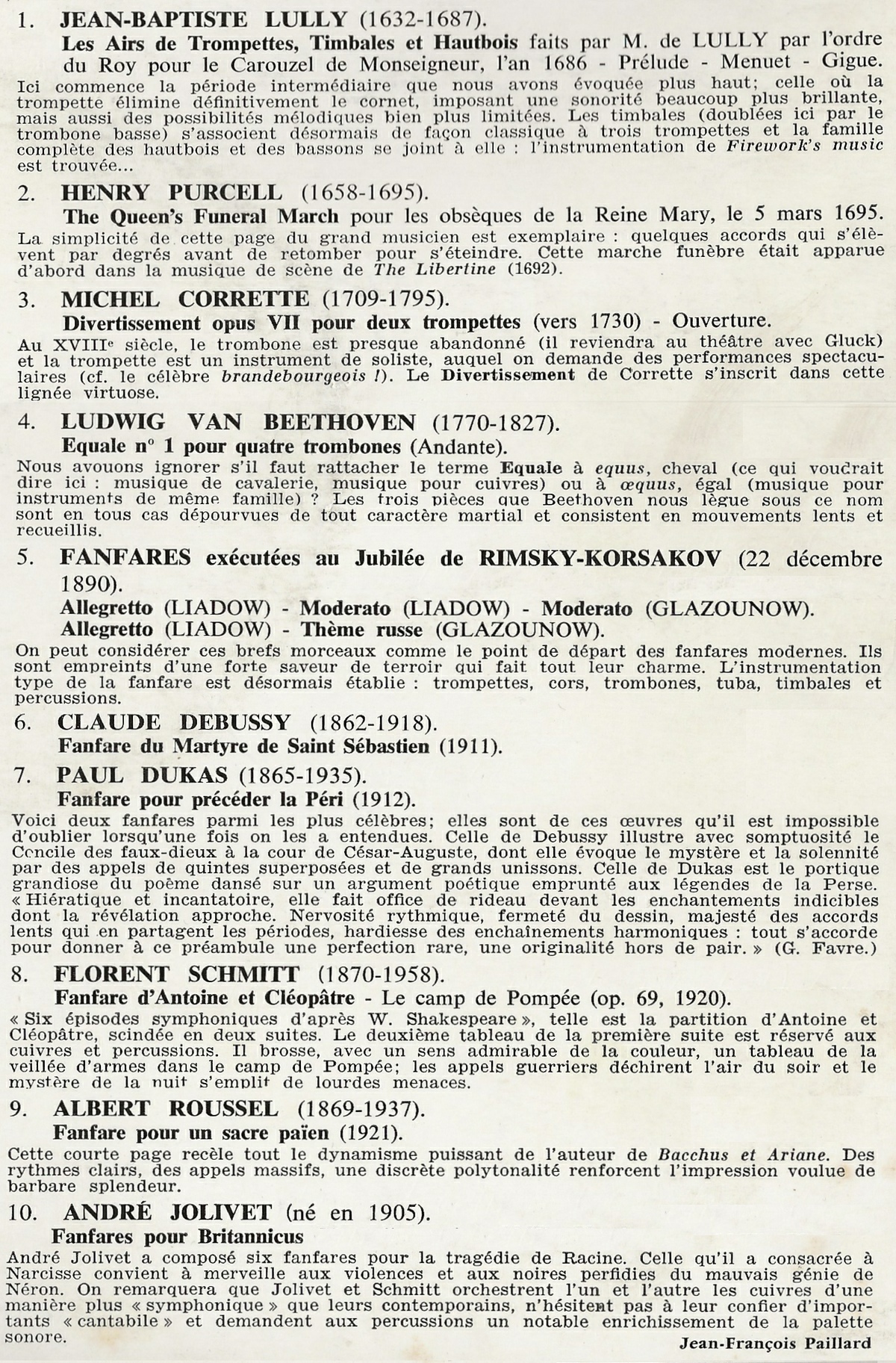 Les premiers exemples notés d’une musique instrumentale indépendante et polyphonique remontent au XIIIe siècle. Au XIVe siècle, les documents attestent le développement des fanfares de cuivres; ainsi, en 1393, lors d’une entrée royale à Barcelone, on nous parle de «XXI jutglars trompas e trompetes que tocharen e onoren sortant»; mais il faut attendre le XVe siècle pour que nous parvienne la musique écrite de ces oeuvres de circonstances. Dès lors, et jusqu’à une date assez avancée dans le XVIIe siècle, les fanfares se composent de cornets (instruments à embouchures, comme les trompettes, mais construits en bois recouvert de cuir et percés de trous comme les flûtes) et de saqueboutes ou trombones (de toutes tailles, et couvrant une vaste étendue du soprano à la basse). Dans le courant du XVIIe siècle, les trompettes remplacent les cornes; elles sont beaucoup plus éclatantes, mais ne peuvent émettre qu’un petit nombre de notes, et dans les tessitures aiguës seulement, ce qui explique l’écriture beaucoup plus rudimentaire des fanfares de cette époque. À la fin du XVIIIe siècle, l’invention des pistons renouvelle les possibilités, mais il faudra attendre l’impulsion donnée par les Russes, avec leur sens de la couleur orchestrale, pour que les grands compositeurs s’intéressent à nouveau aux cuivres et leur dédient d’éclatants chefs-d’oeuvre. Ainsi, les fanfares connaissent deux apogées particulièrement brillantes, l’une au XVIe-XVIIe siècle et l’autre au XXe siècle, séparées par une ère infiniment moins riche. [...]" cité des notes de Jean-François Paillard publiées au verso de la pochette du disque Erato LDE 3278