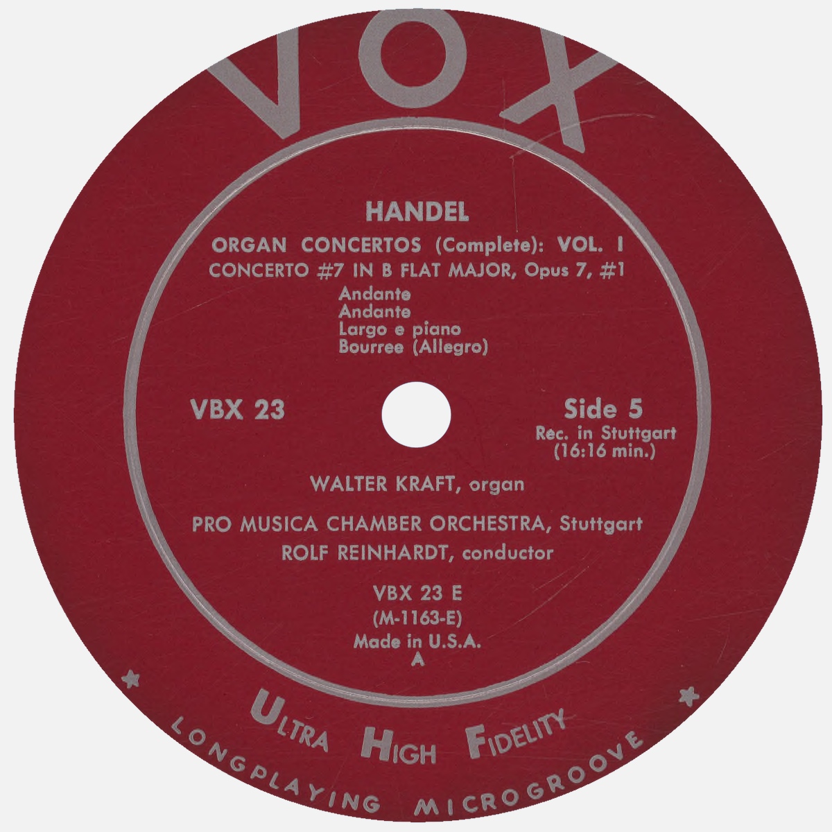 Georg-Friedrich Händel, Concerto pour orgue et orchestre op. 7 No 1 en si bémol majeur, HWV 306, Helma Elsner, clavecin, Walter Kraft, orgue, Orchestre de Chambre Pro Musica de Stuttgart, Rolf Reinhardt, été 1951