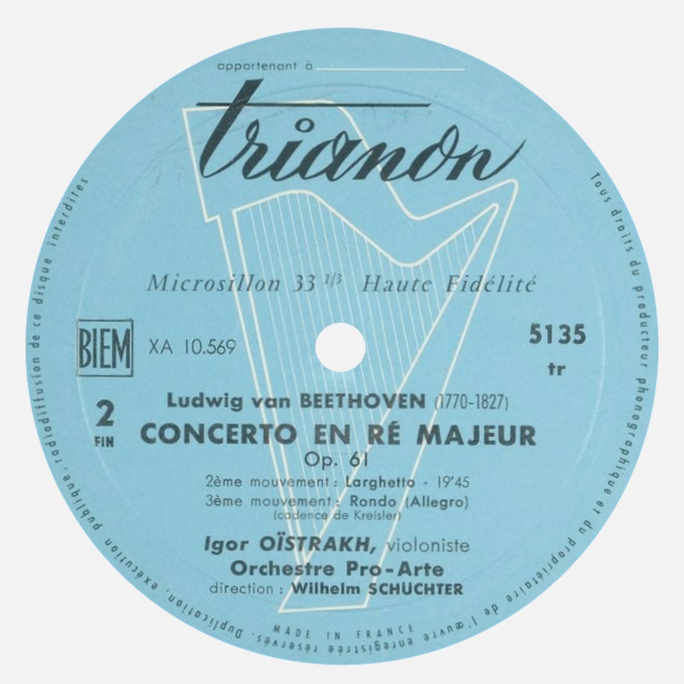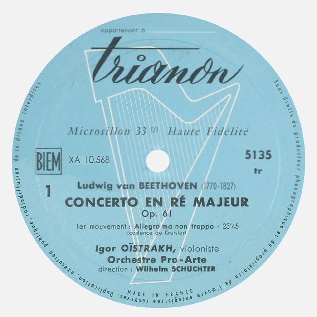 Dans le concerto de Beethoven, Igor Oistrach jouait les cadences de Fritz Kreisler, ainsi qu'indiqué sur les étiquettes de cette réédition Trianon TRS 5135: