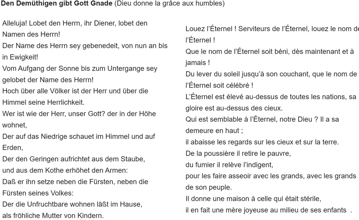 Psaume 112, texte en allemand: Joseph Franz von Allioli, Die Heilige Schrift des alten und neuen Testamentes, Dritter Band (mit Approbation des apostolischen Stuhles), 4. Auflage, p. 243, Landshut, 1839; texte en français: