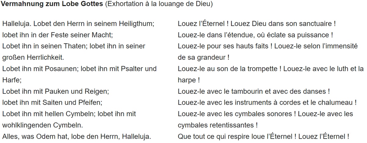 Psaume 150, texte en allemand: Die Bibel, oder die ganze Heilige Schrift des alten und neuen Testaments, nach der deutsche Übersetzung D. Martin Luthers, abgedruckt nach der Hallischen Ausgabe, 1839, p. 683; texte en français:
