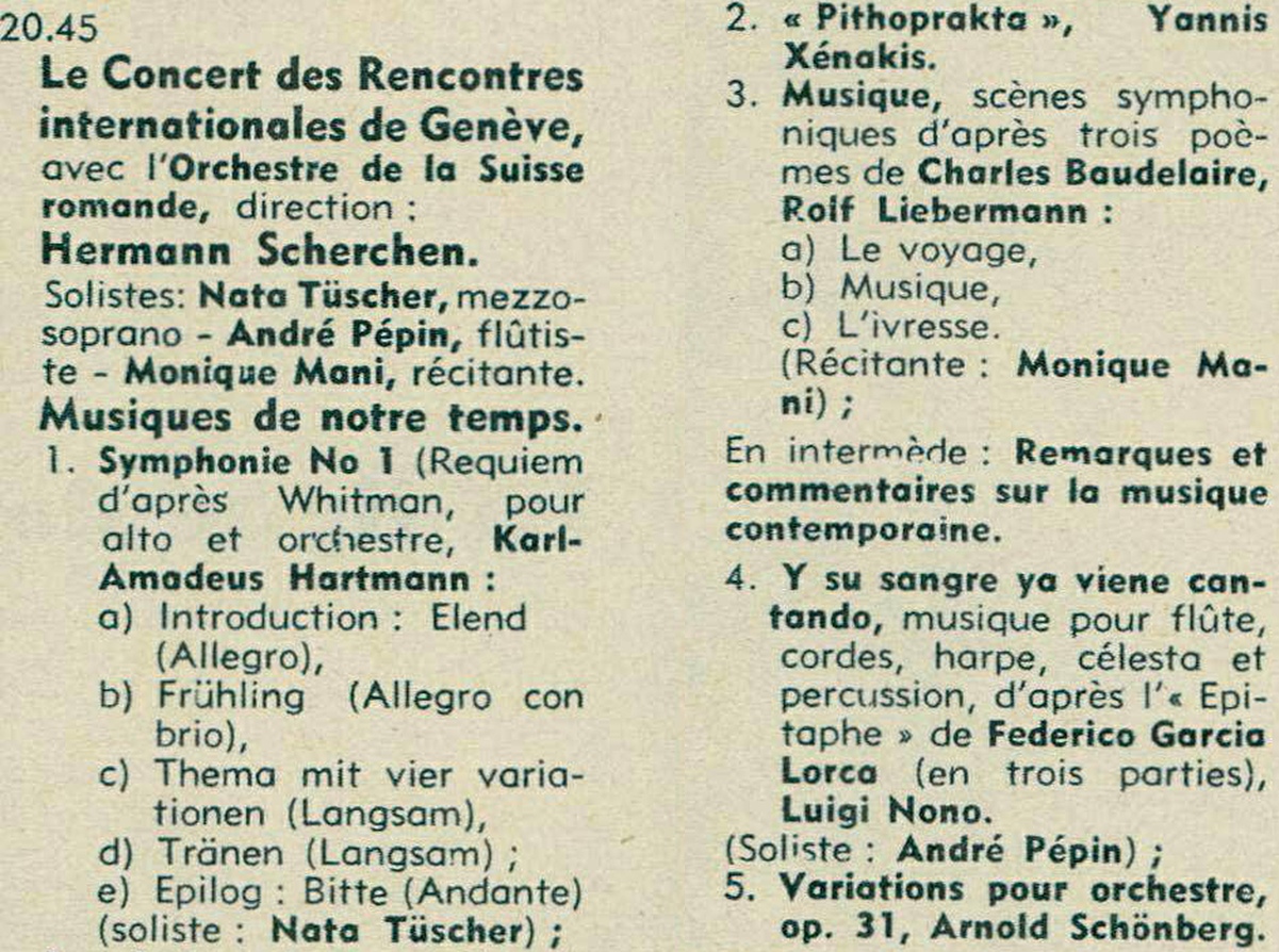Ce titre l’indique, les chefs-d'oeuvre consacrés, classiques ou modernes, étaient cette fois-ci bannis du programme du concert offert comme chaque année par la Fondation des émissions de Radio-Genève aux hôtes des Rencontres internationales. L’esprit le plus large, ouvert à toutes choses, règne dans notre studio radiophonique. Sachons gré à ses dirigeants de nous avoir donné l’occasion d’entendre des pages comme celles, intéressantes à des titres divers, de Karl Amadeus Hartmann (1905), Yannis Xenakis (1921), Rolf Liebermann (1910), Luigi Nono (1926) et Arnold Schonberg, exécutées mercredi par l’OSR sous la direction d’Hermann Scherchen.
