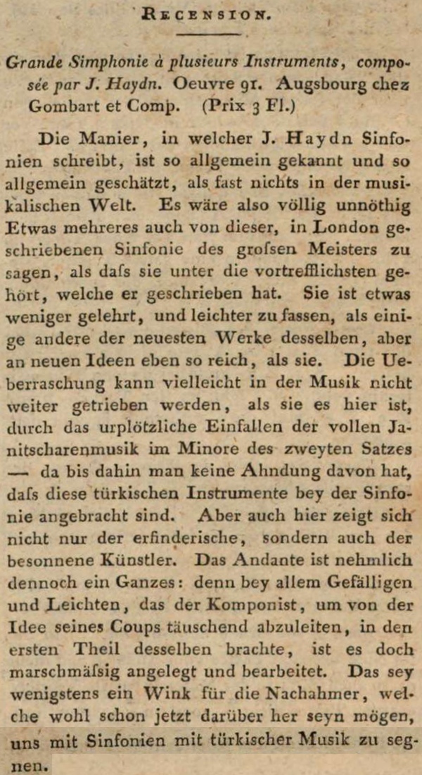 Le 4 février 1794, Joseph Haydn arrive à Londres pour son second séjour dans cette ville, avec un agenda fourni. Douze concerts sont au programme - organisés par son impresario Salomon - avec de nouvelles compositions, parmi lesquelles six symphonies. Le 31 mars 1794, Haydn présenta au public sa Symphonie No 100, la „Militaire“ - la huitième de ses 12 symphonies dites „londoniennes“. Ce surnom étant sur les affiches, il est certainement de Haydn ou de Salomon. Dans des éditions plus tardives, la symphonie porte également le nom de „Symphonie turque“.