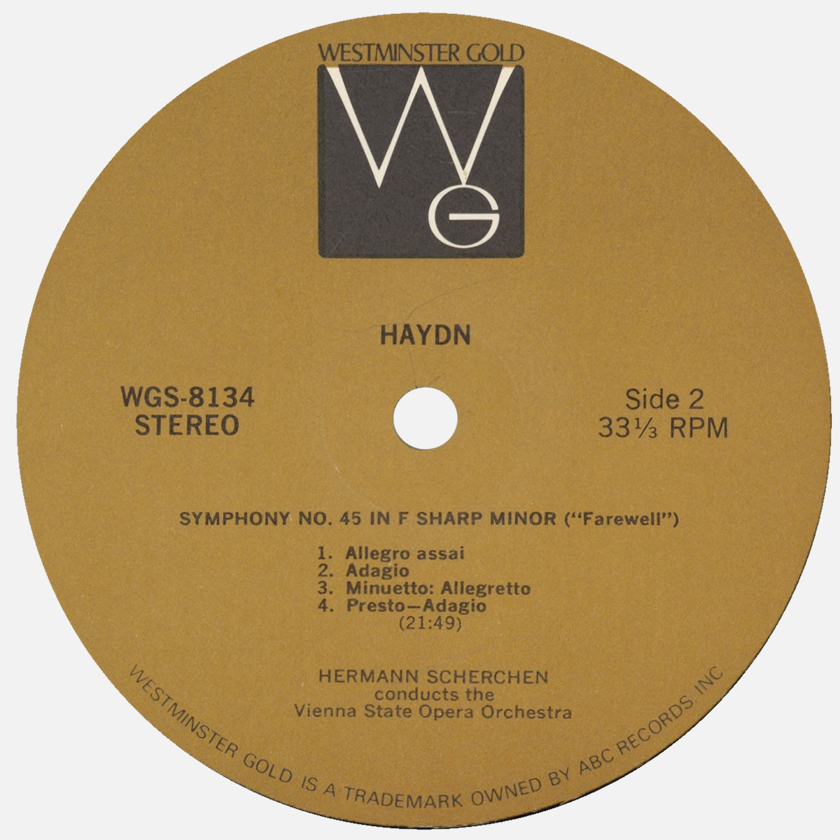 Joseph Haydn, Symphonie No 45 en fa dièse mineur, "Les Adieux", Orchestre de l'Opéra d'État de Vienne, Hermann Scherchen, juillet 1958, Salle Mozart du «Konzerthaus» de Vienne