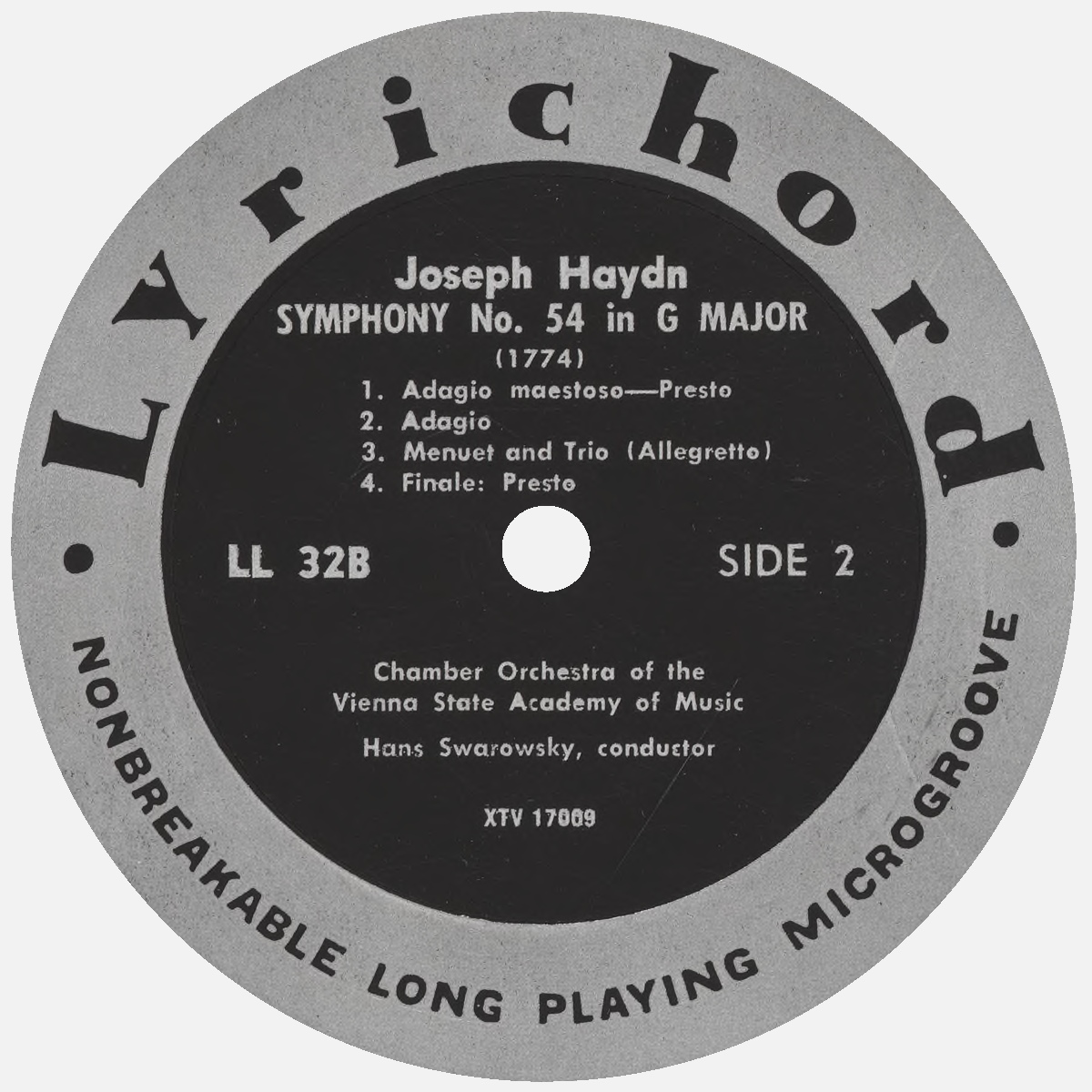 Joseph Haydn, Symphonie No 54 en sol majeur, Orchestre de chambre de l'Académie d'État de Musique de Vienne, Hans Swarowsky, février 1952, Salle Mozart du «Konzerthaus» de Vienne