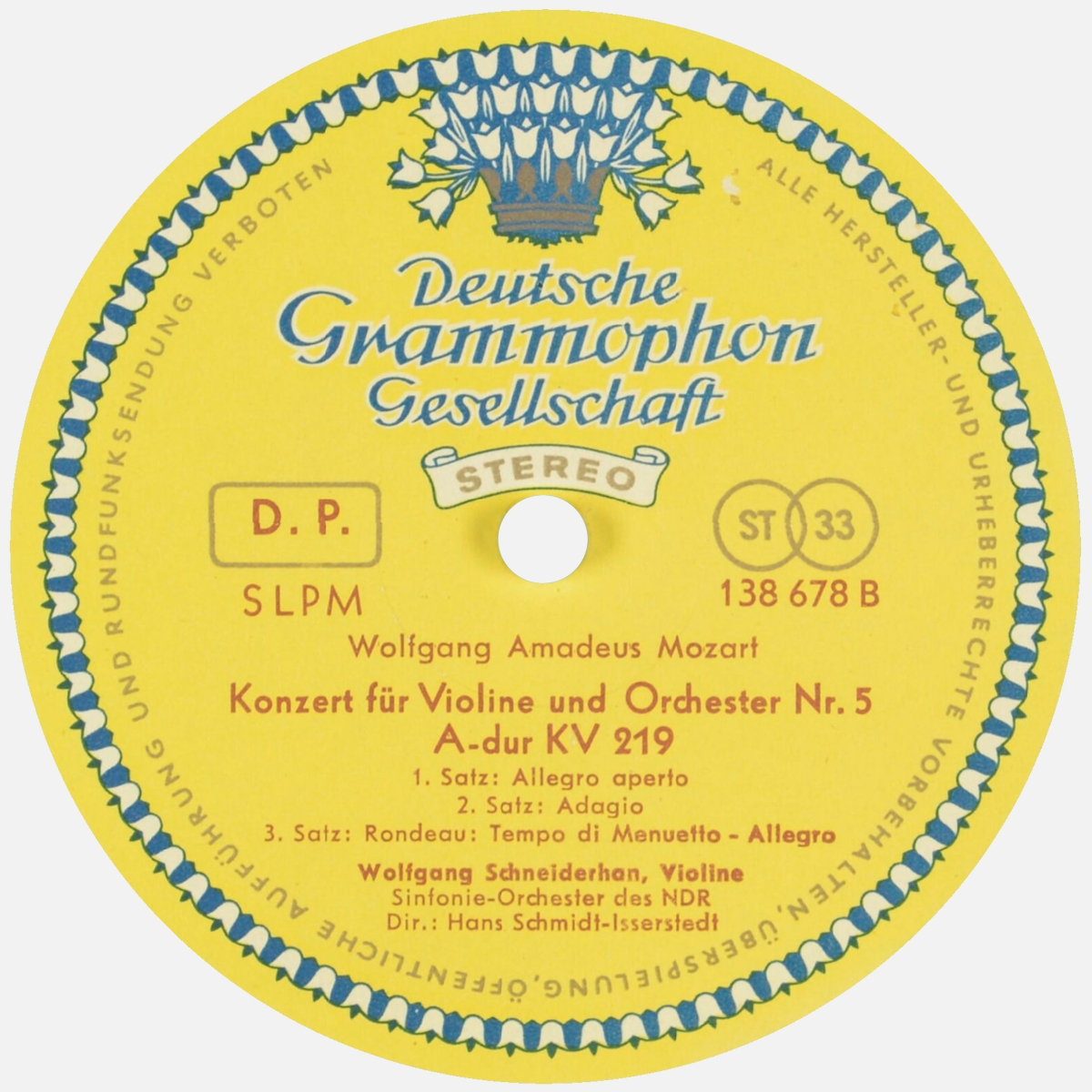 Le Concerto No 5 en la majeur, KV 219, porte la date du 20 décembre 1775, donc composé par Wolfgang Amadeus MOZART à l'âge de 19 ans, alors qu'il était premier violon à l'orchestre du Prince-Archevèque de Salzburg. Pour une courte présentation des concertos No 4 et No 5, voir cette page de mon site avec une courte description extraite du verso de la pochette de ce disque SLPM 138 678.