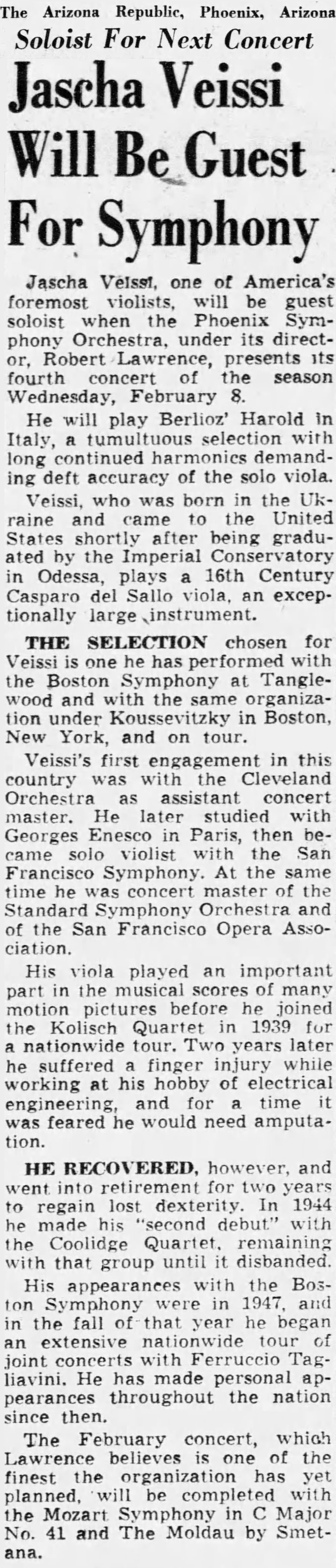 (*) Traduit d'un extrait du texte publié le 29 janvier 1950 dans le quotidien «The Arizona Republic» (voir plus bas pour l'entier du texte d'origine): «Jascha Veissi, né en Ukraine, est arrivé aux États-Unis peu après avoir obtenu son diplôme au Conservatoire Impérial d'Odessa, jouant d'un alto Casparo del Sallo du XVIe siècle, un instrument d'une taille exceptionnelle.