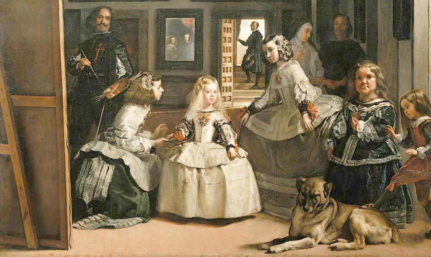 Extrait du tableau «Las Meninas» (Les demoiselles d'honneur) de Diego Velázquez, peint en 1656, se trouvant au Musée du Prado de Madrid "[...] Ce tableau dépeint une très grande pièce du palais du roi Philippe IV dans laquelle se trouvent plusieurs personnages de la cour. La jeune infante Marguerite-Thérèse est entourée de demoiselles d'honneur, d'un chaperon, d'un garde du corps, d'une naine, d'un enfant italien et d'un chien. Derrière eux, Velázquez se représente lui-même en train de peindre, regardant au-delà la peinture, comme s'il regardait directement l'observateur de la toile. [...]" cité de Wikipedia