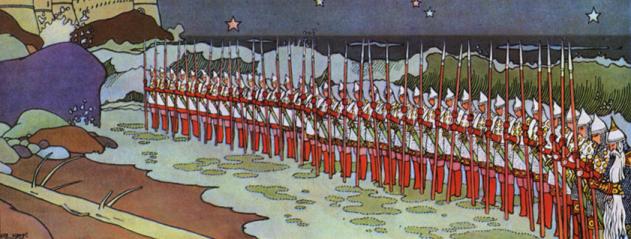 1. Introduction du premier acte (après le prologue): Adieux et départ du tsar, partant en guerre. Mélodies de marche dans un coloris brillant absolument typique de Rimski-Korsakow.