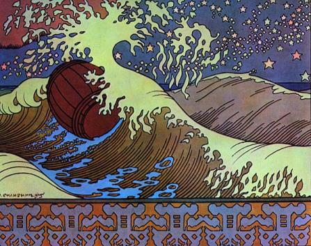 2. Introduction du deuxième acte: la mer, sur laquelle flotte le tonneau dans lequel ont été enfermés la tsarine Militrissa et le tsarévitch Guidon. Rimski-Korsakow décrit l'enflement inquiétant des vagues.