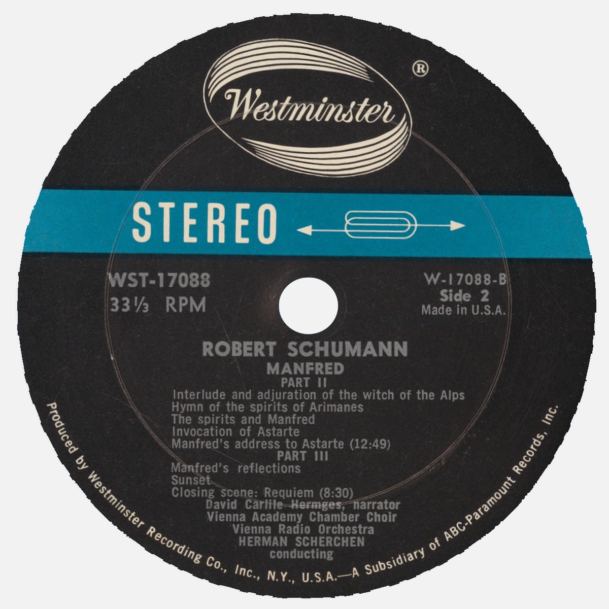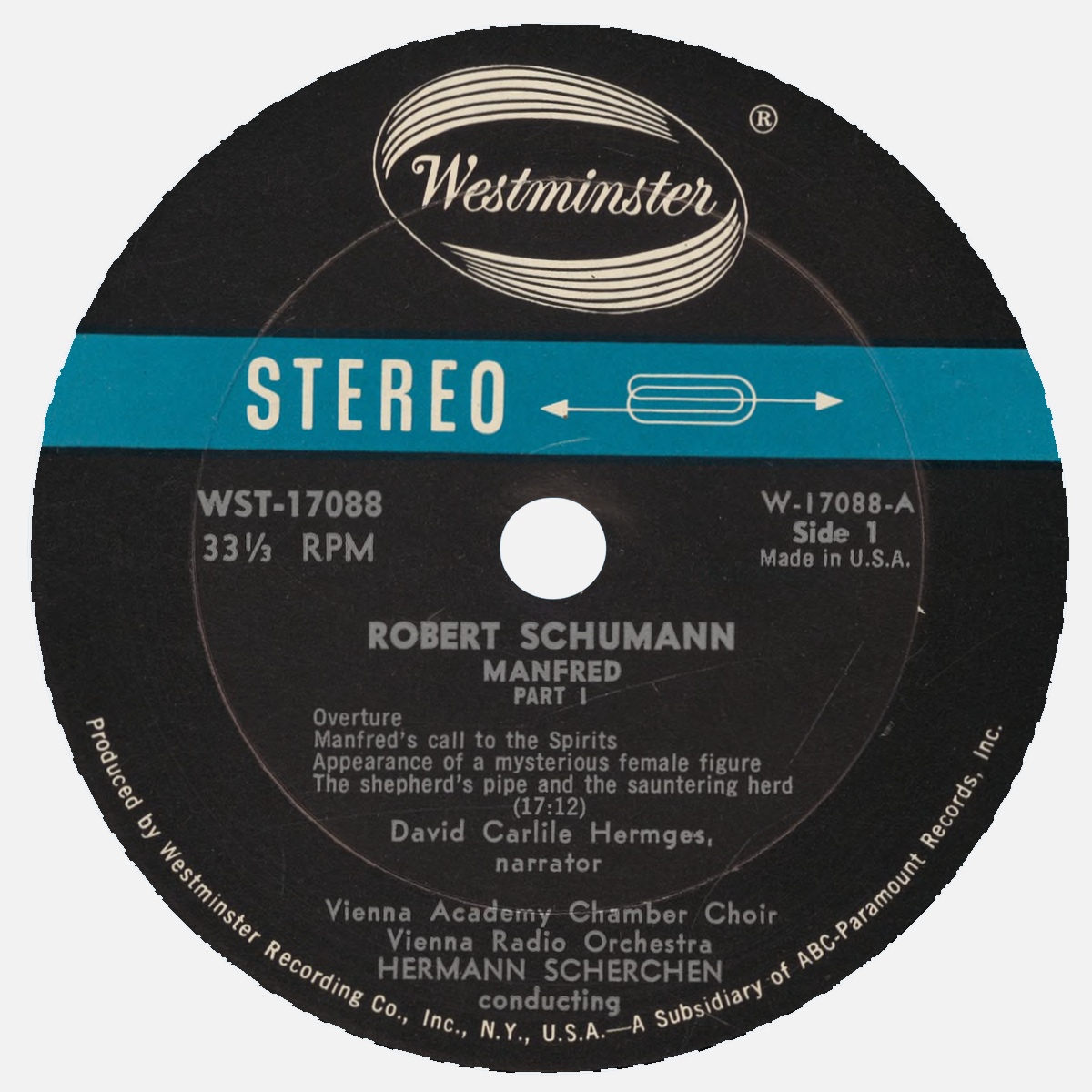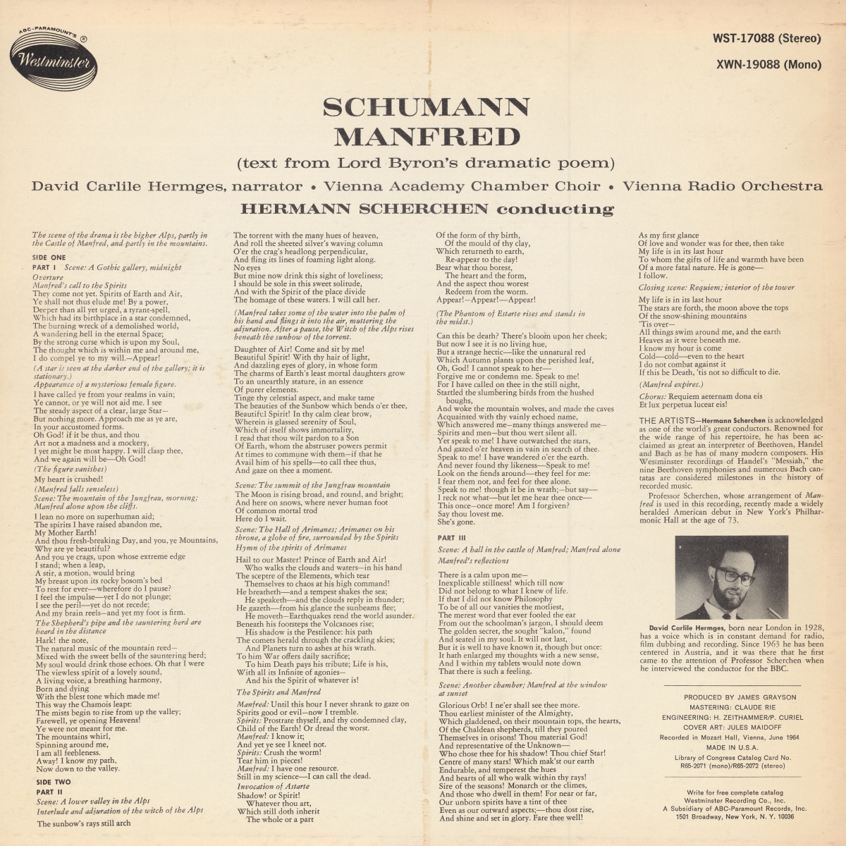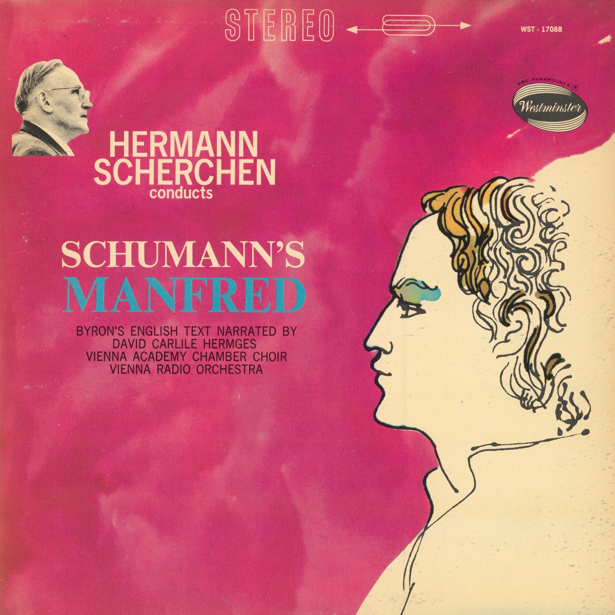 Robert Schumann, Manfred, Poème dramatique en trois parties, op. 115, dans un arrangement de Hermann Scherchen, David Carlile Hermges, narrateur / Manfred, Choeur de chambre de l'Académie de Vienne («Wiener Akademie Kammerchor»), Grand Orchestre de la Radio Autrichienne («Grosses Orchester des Österreichischen Rundfunks (ORF)», l'actuel «ORF Radio-Symphonieorchester Wien»), Hermann Scherchen, 17 juin 1964, Salle Mozart du «Konzerthaus Wien».