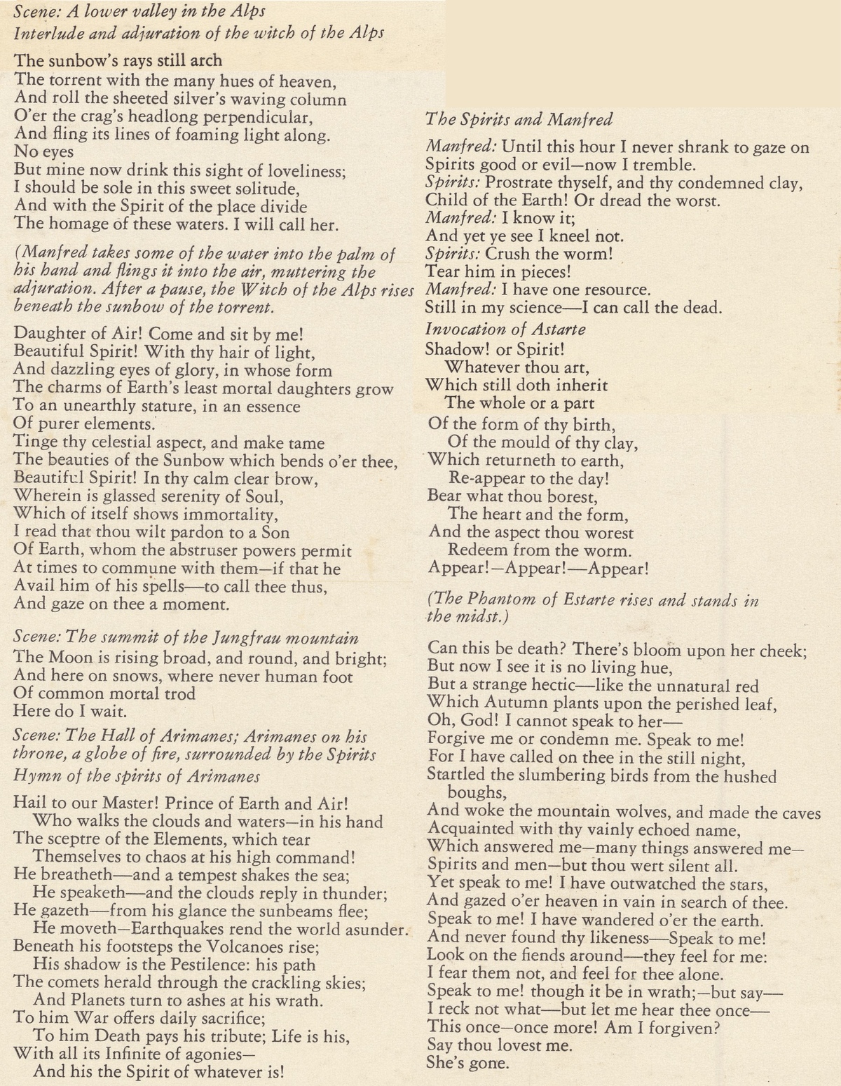 Interlude and adjuration of the witch of the Alps - Hymn of the spirits of Arimanes - The spirits and Manfred - Manfred's address to Astarte