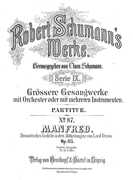 Une excellente courte description du drame de Byron tel qu'utilisé par Robert Schumann dans son „Manfred“, «Dramatisches Gedicht in drei Abteilungen nach Lord Byron für elf Sprechrollen, sieben Solostimmen, fünfstimmigen Chor und Orchester op. 115», citée d'un texte de Irmgard KNECHTGES-OBRECHT publié sur cette page du site www.schumann-portal.de:
