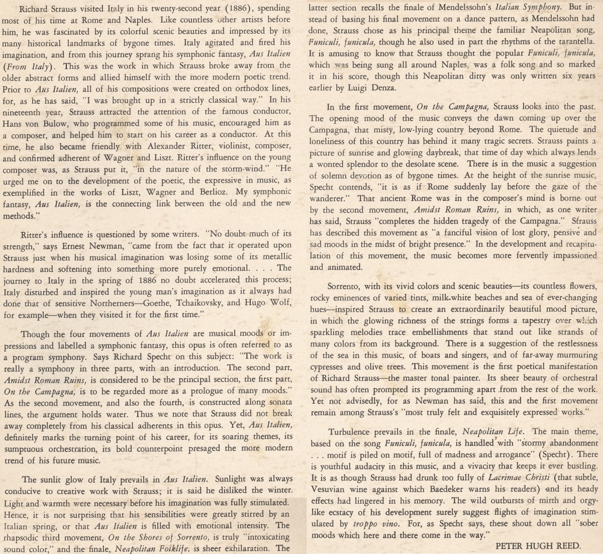 D'octobre 1885 à avril 1886, Richard Strauss assista Hans von Bülow dans la direction de l'orchestre de Meiningen. Il y fit notamment la connaissance de Johannes Brahms et d'Alexander Ritter - ce dernier l'orienta vers l'étude des oeuvres de Berlioz, Liszt et Wagner, et l'incita à composer des poèmes symphoniques. D'autre part, Johannes Brahms lui conseilla de séjourner quelques temps en Italie: c'est ainsi que le jeune Richard Strauss fut amené à partir en vacances en Italie et à y commencer d'écrire son premier poème symphonique - intitulé «Aus Italien» - qui est en fait une symphonie formée de quatre poèmes symphoniques.