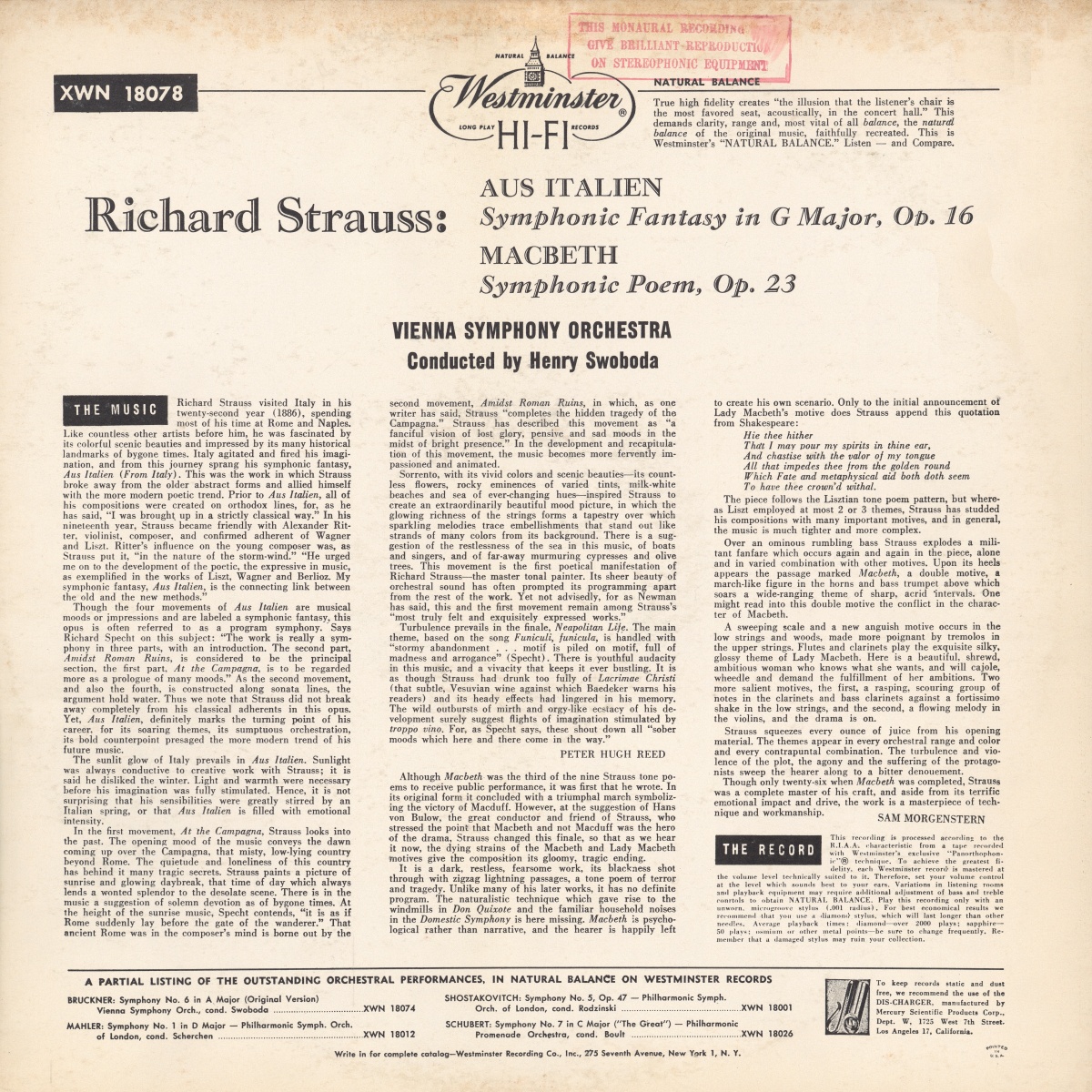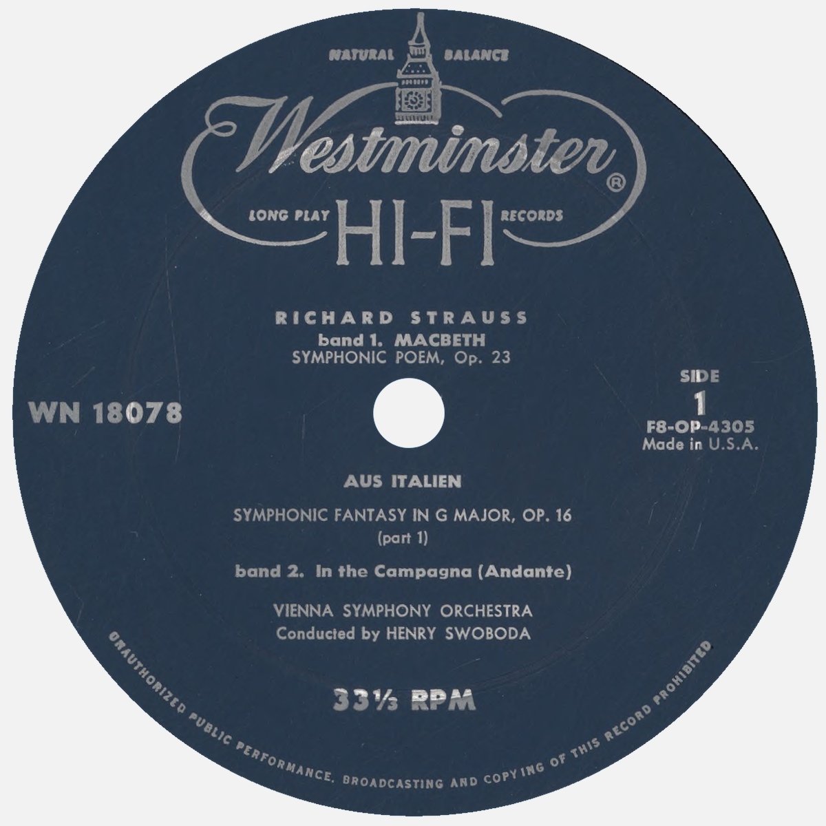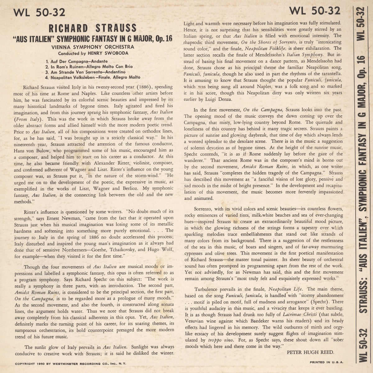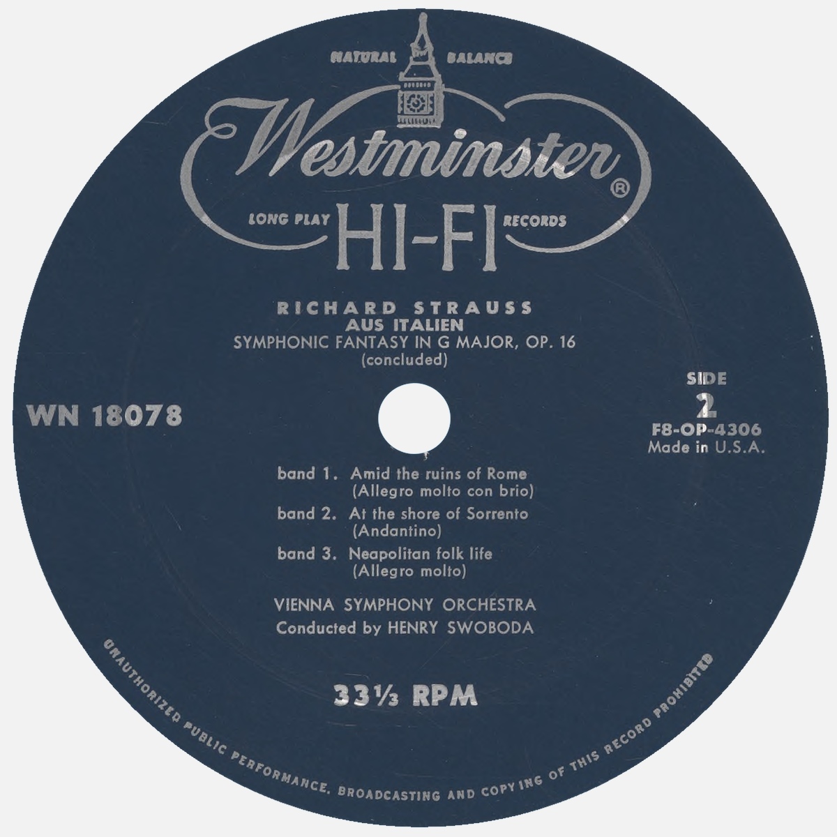 Konzerthaus Wien», début janvier 1950: l'Orchestre Symphonique de Vienne sous la direction de Henry SWOBODA sont les premiers à enregistrer cette oeuvre pour le disque - elle fut publiée peu après sur le 33 tours Westminster WL 5032: