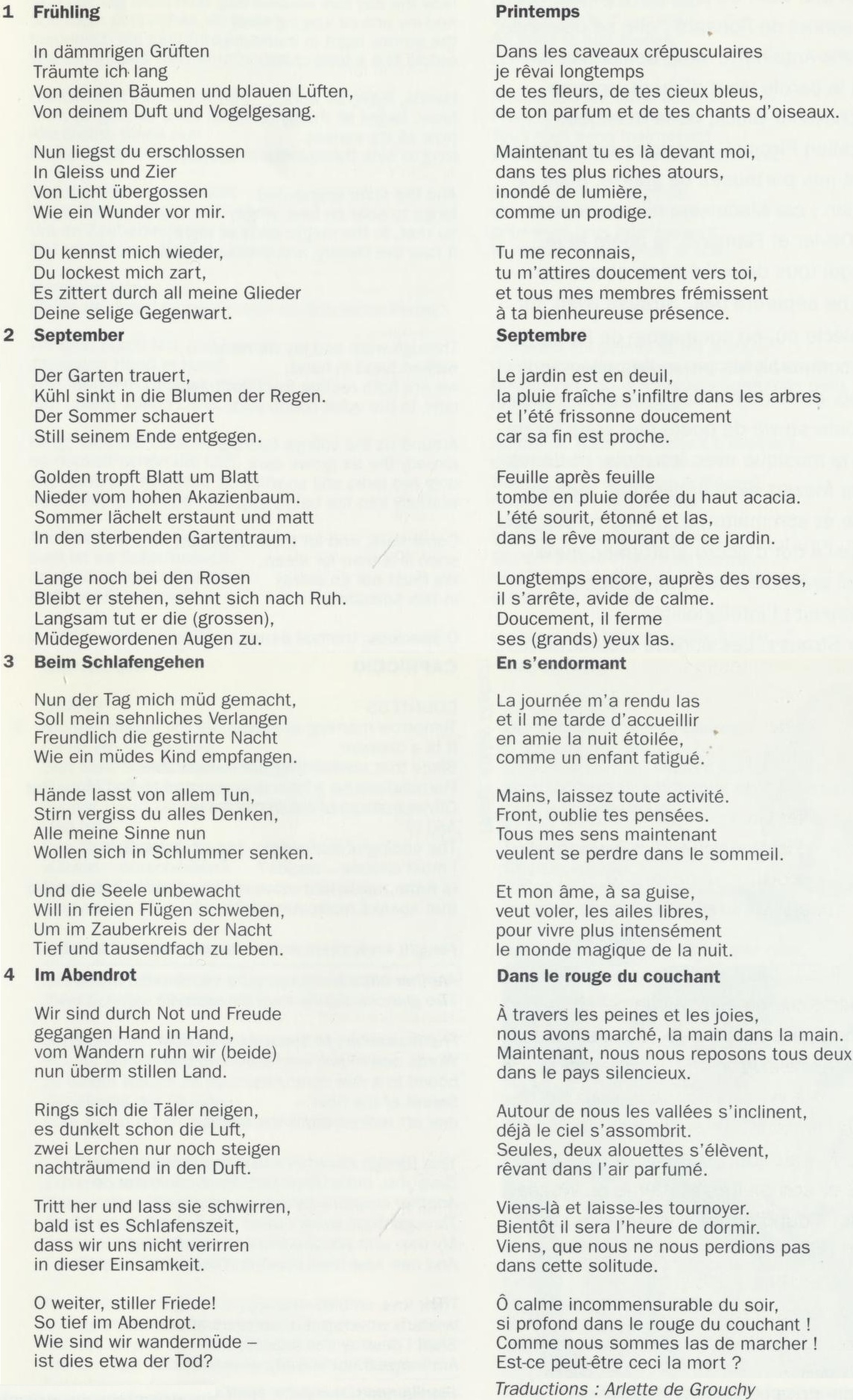 Les sentiments printaniers dominent encore le premier lied «Frühling», mais dans les deux suivants, «September» et «Beim Schlafengehen» l'atmosphère devient plus profonde. Dans le dernier lied «Im Abendrot» un vieux couple regarde le crépuscule, et au moment mème où les paroles à la fin demandent «Ist dies etwa der Tod » (Est-ce bien la mort?) on entend une citation du poème symphonique «Tod und Verklärung» que Strauss écrivit presque soixante ans plus tôt.